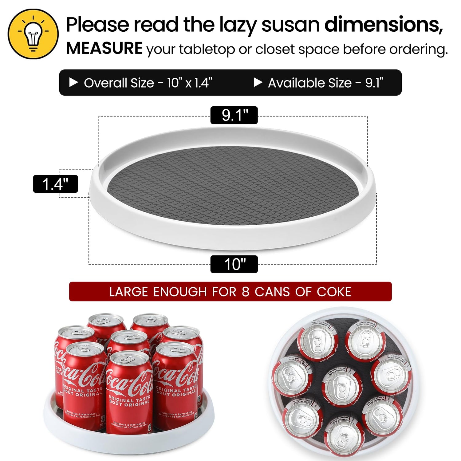 - [ Please Note ] - The lazy susan is large enough for 8 cans of coke (refer to the 2rd image). Please read the lazy susan dimensions and measure your tabletop or closet space before ordering in case it doesn't fit. Overall Size - 10" x 1.4". Available Size - 9.1"