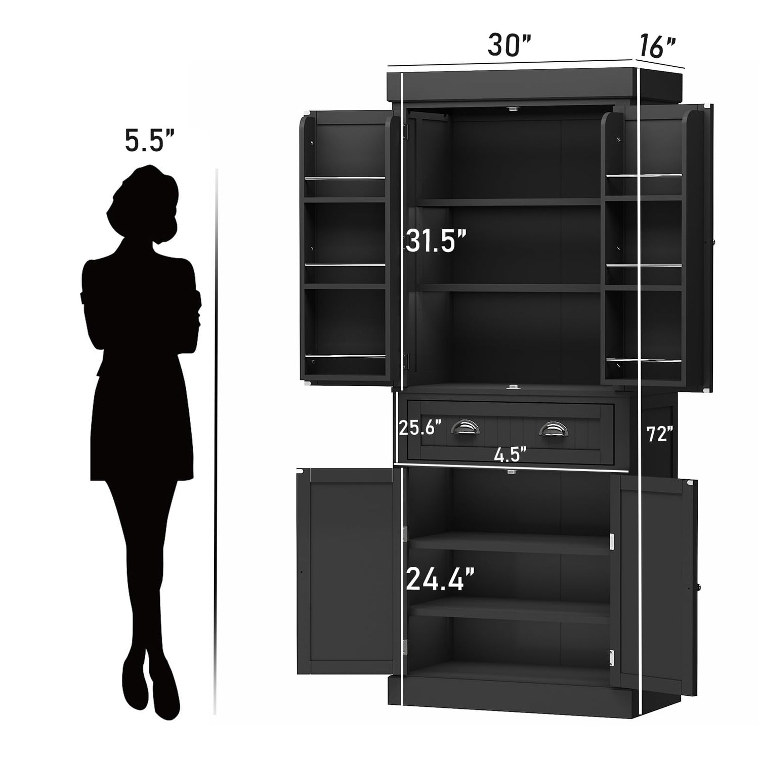 Squireewo 72" Freestanding Kitchen Pantry Storage Cabinet with Doors and 6 Hanging Shelves,Storage Cupboard with Large Drawer for Kitchen,Bathroom or Hallway,Black