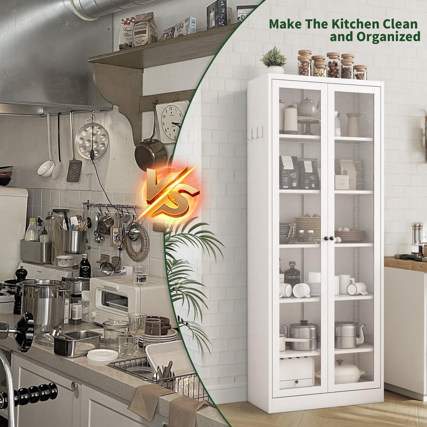 - Heavy-Duty Steel Construction with Enhanced Capacity.Built with commercial-grade metal pantry cabinet with doors, our farmhouse kitchen pantry features reinforced cold-rolled steel frames with scratch-resistant coating. The tall 72" height provides 30% more storage than standard cabinets, with each of the 4 adjustable shelves supporting 50lbs (total 200lbs+ capacity). The deep pantry cabinet design (13.78"D) accommodates bulk items while the clear glass upper doors allow easy visibility of stored contents.