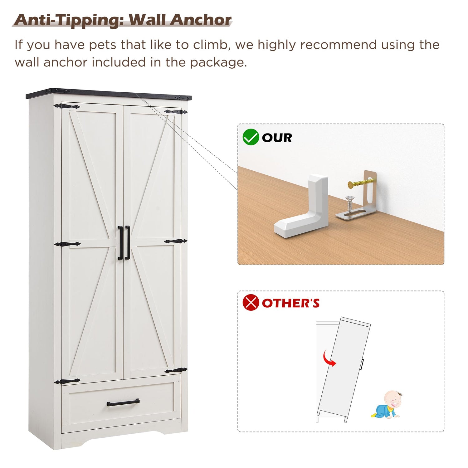 - Sturdy and Safe Design: Crafted from high-quality engineered wood and metal, this cabinet is built for stability and longevity. It includes an anti-tip safety kit for secure wall mounting, ensuring stability even in households with pets. Enjoy peace of mind knowing your family’s safety is a priority