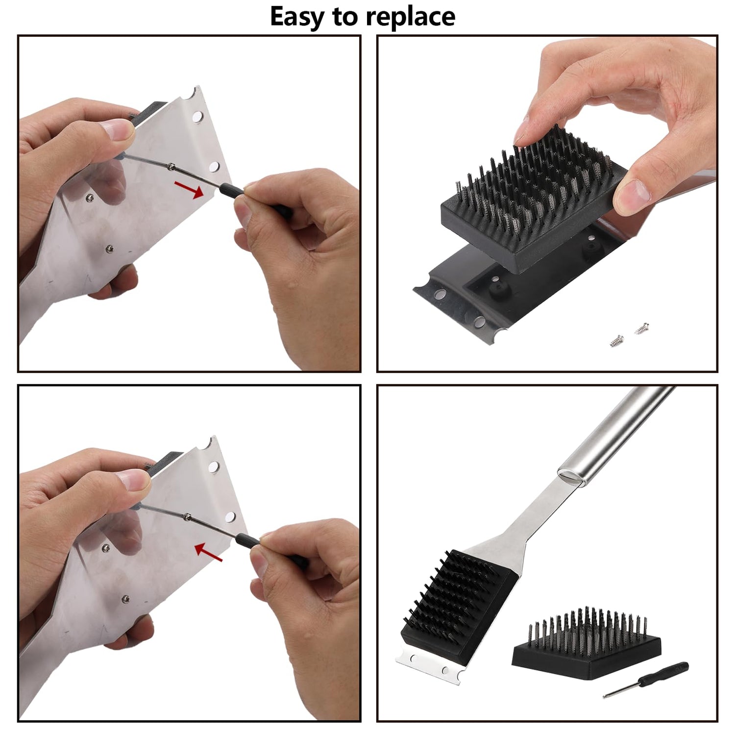 • Versatile and Gift-Worthy: This set has a 16.5” Grill Brush, 2 Brush Replacements and a Screwdriver. Suitable for all types of grates, including charcoal, smoker, porcelain, infrared, Weber, and Foreman grills, this brush restores grates to their brand-new look in seconds. Its sleek design and superior quality make it a perfect gift for BBQ lovers, complementing their BBQ utensils beautifully.