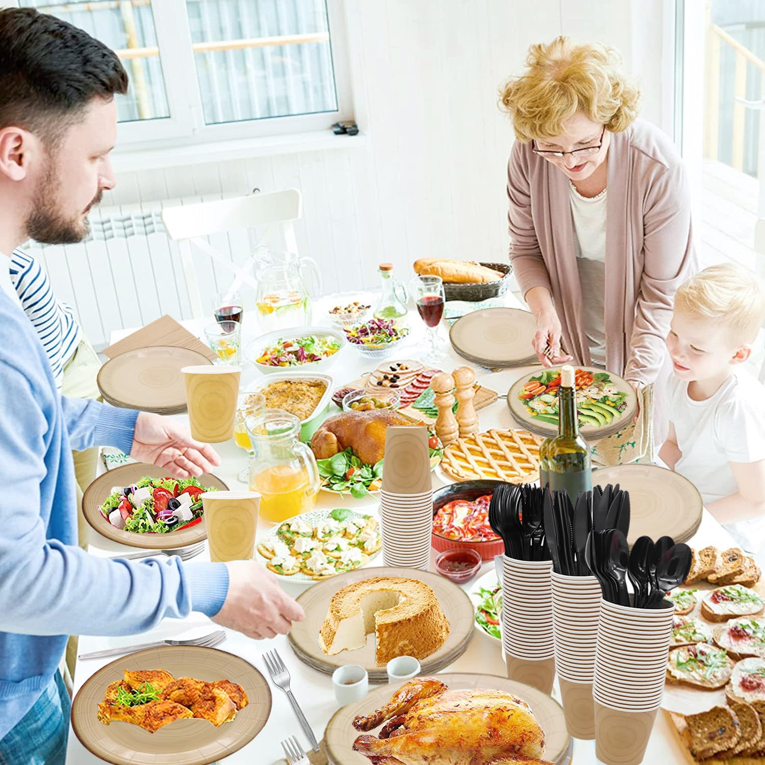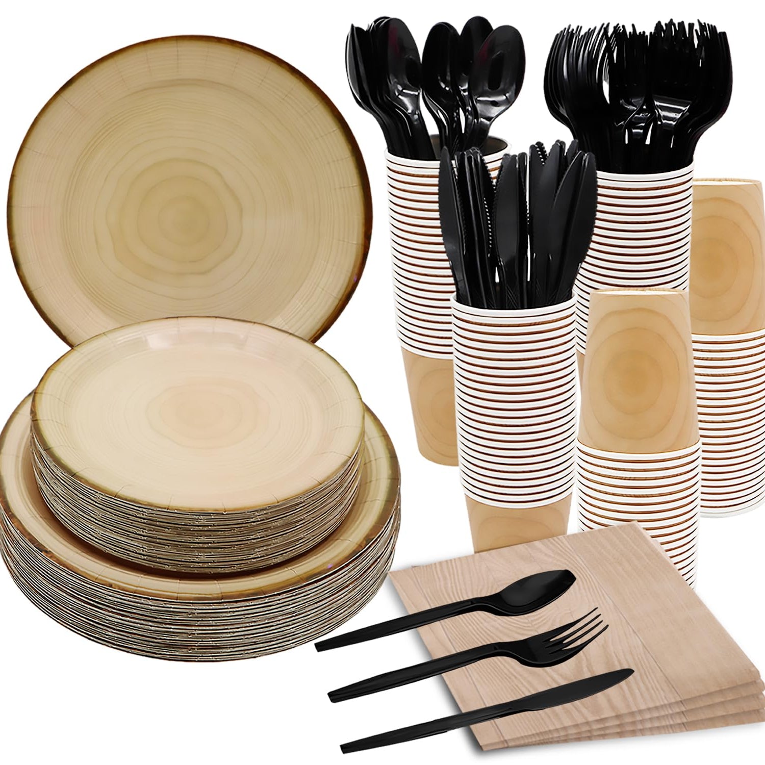 - 【SERVES 25 GUESTS】:This wood grain party supplies sets has all you need for 25 guests,includes 25pcs 9'' wood paper dinner paper plates,25pcs 7'' wood grain dessert plates,25pcs paper napkins,25pcs 9 Oz paper Cups,25pcs forks,25pcs spoons,25pcs knives.