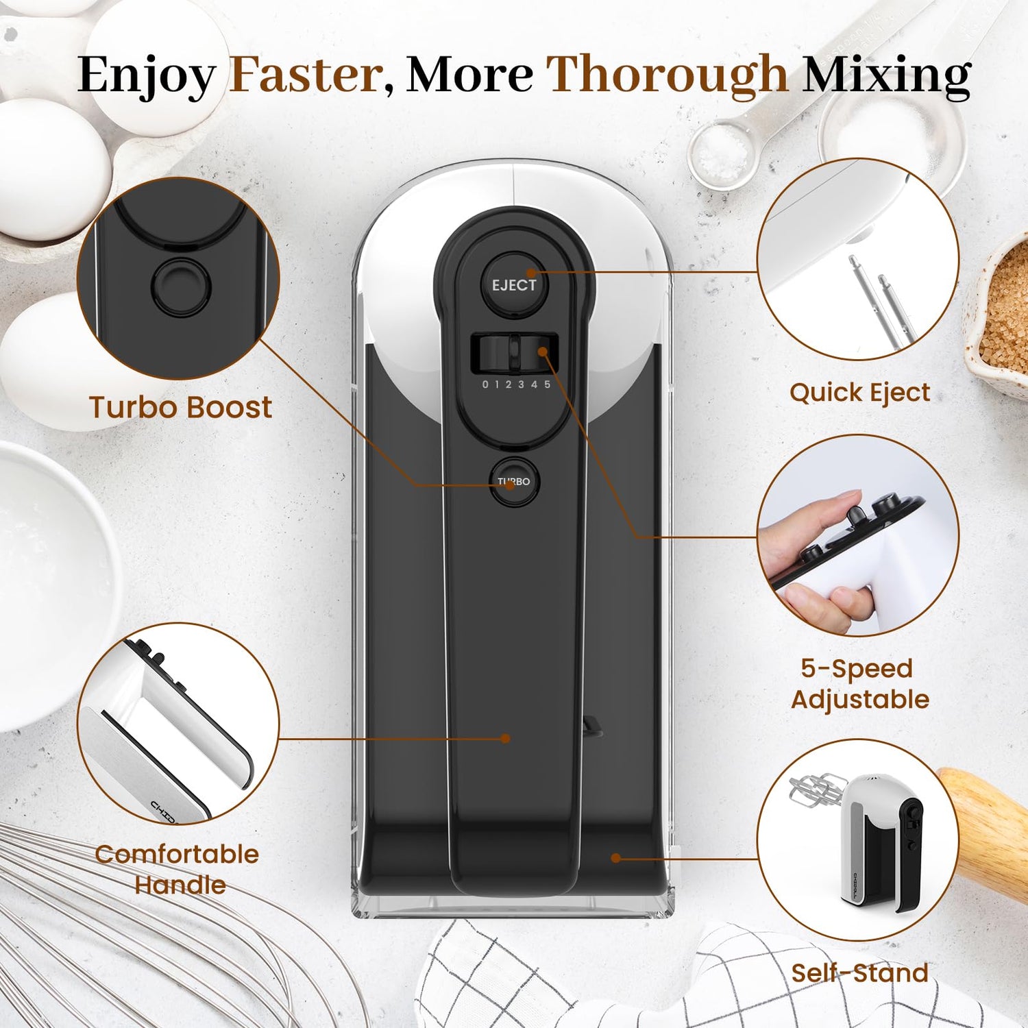 - ใ๐๐ข๐ฑ ๐ฐ๐ข๐ญ๐ก ๐๐๐ฌ๐ใMix your ingredients thoroughly, Food grade stainless steel attachments are dishwasher safe, easy to clean. Built from durable materials, the hand mixer is made to last, Air vents both front and back, fast heat dissipation for stable performance and long life of the mixer