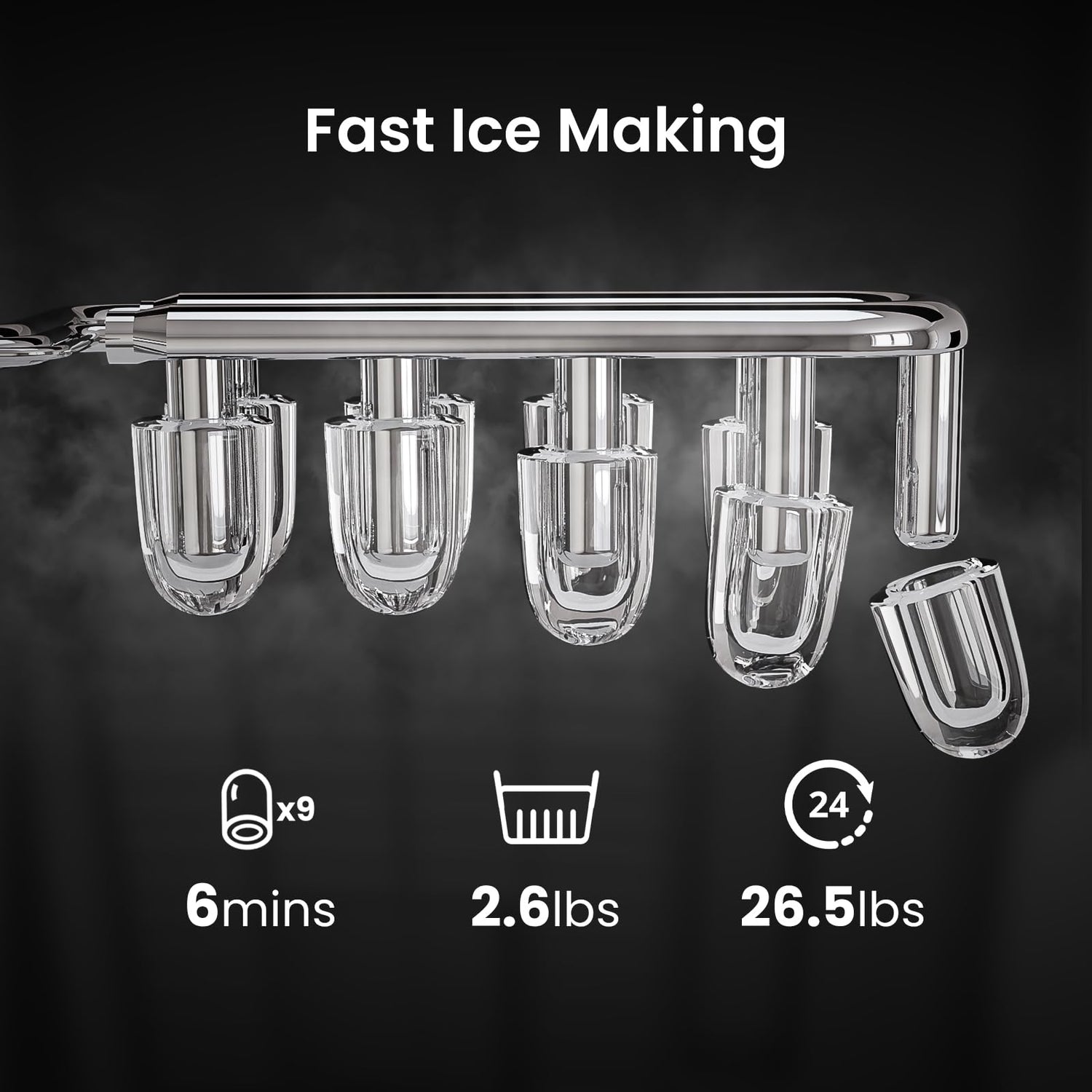 AGLUCKY Ice Makers Countertop with Handle,26.5Lbs/24H,9 Cubes in 6 Mins,2 Sizes of Bullet Ice,Portable Machine with Self-Cleaning,Perfect for Home Kitchen(Black)
