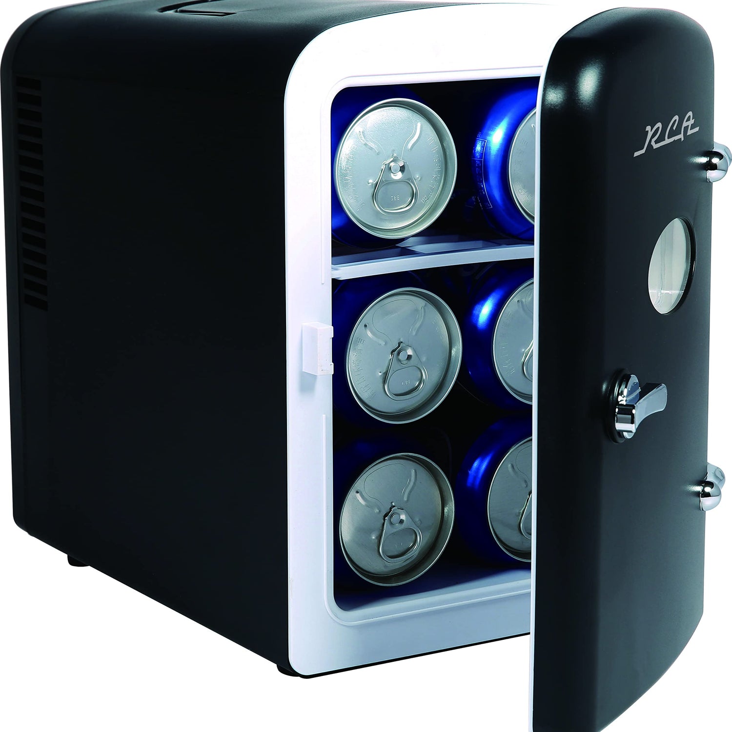 Details: RCA Mini Retro 6 Can Beverage Refrigerator-Black, RMIS129-BLACK.