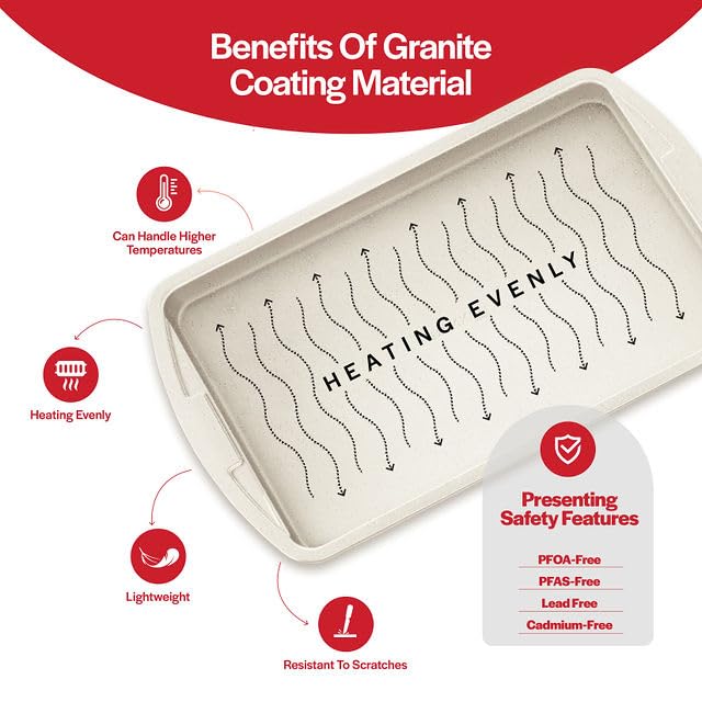 • VERSATILE AND SAFE - suitable for use in the oven, refrigerator, and freezer, our bakeware pan set is PFOA, PFOS, and PTFE-free, ensuring the health and safety of your family. It's dishwasher safe for convenience but we recommend hand-washing to maintain the long-lasting, stain-resistant properties of each of our baking set gift items