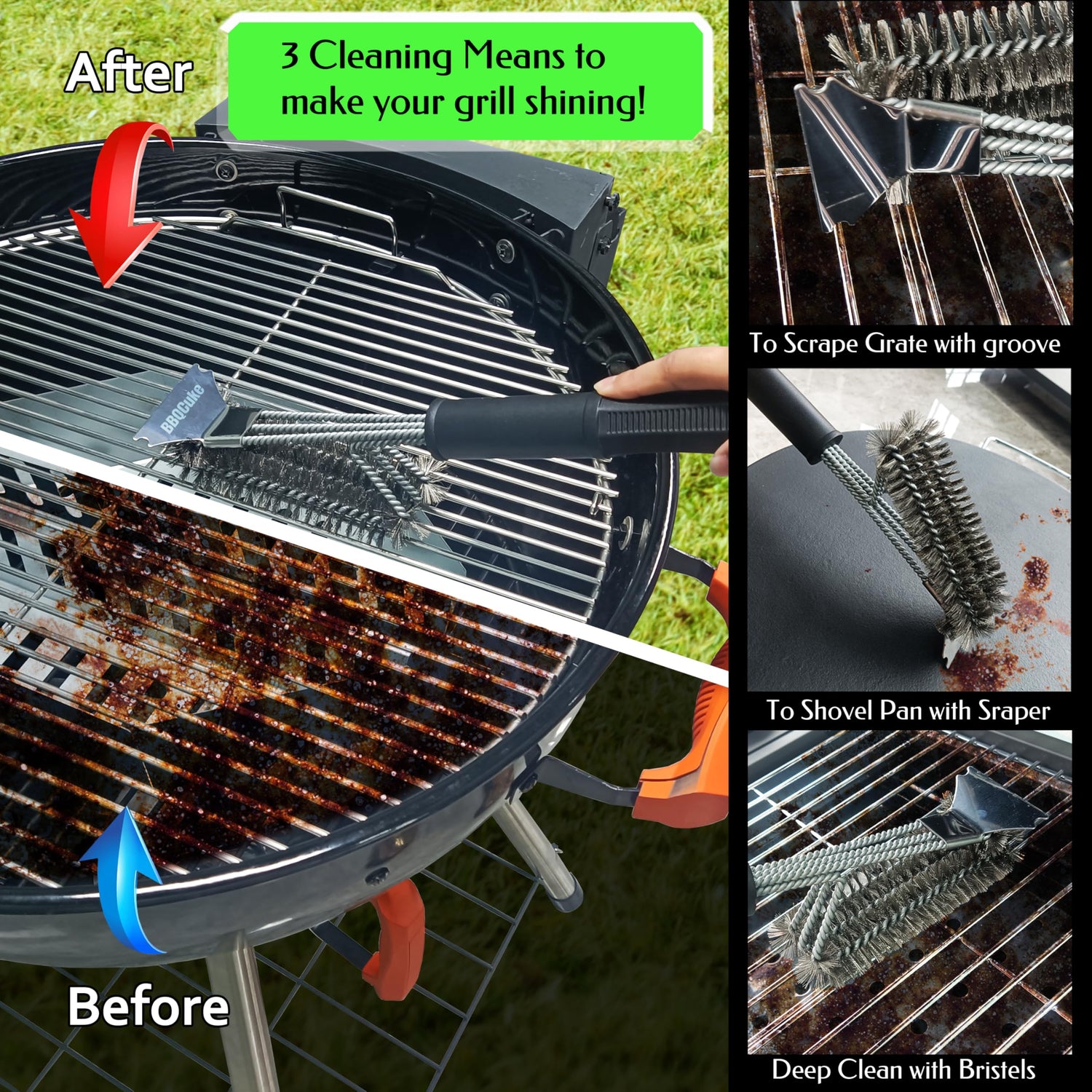 BBQcuker Grill Brush with Scraper, BBQ Cleaning Brush for Outdoor Grill, Grill Cleaner with Stainless Steel Scraper and Bristles,18" Grill Accessories with Stainless Steel Hanger and Plastic Handle