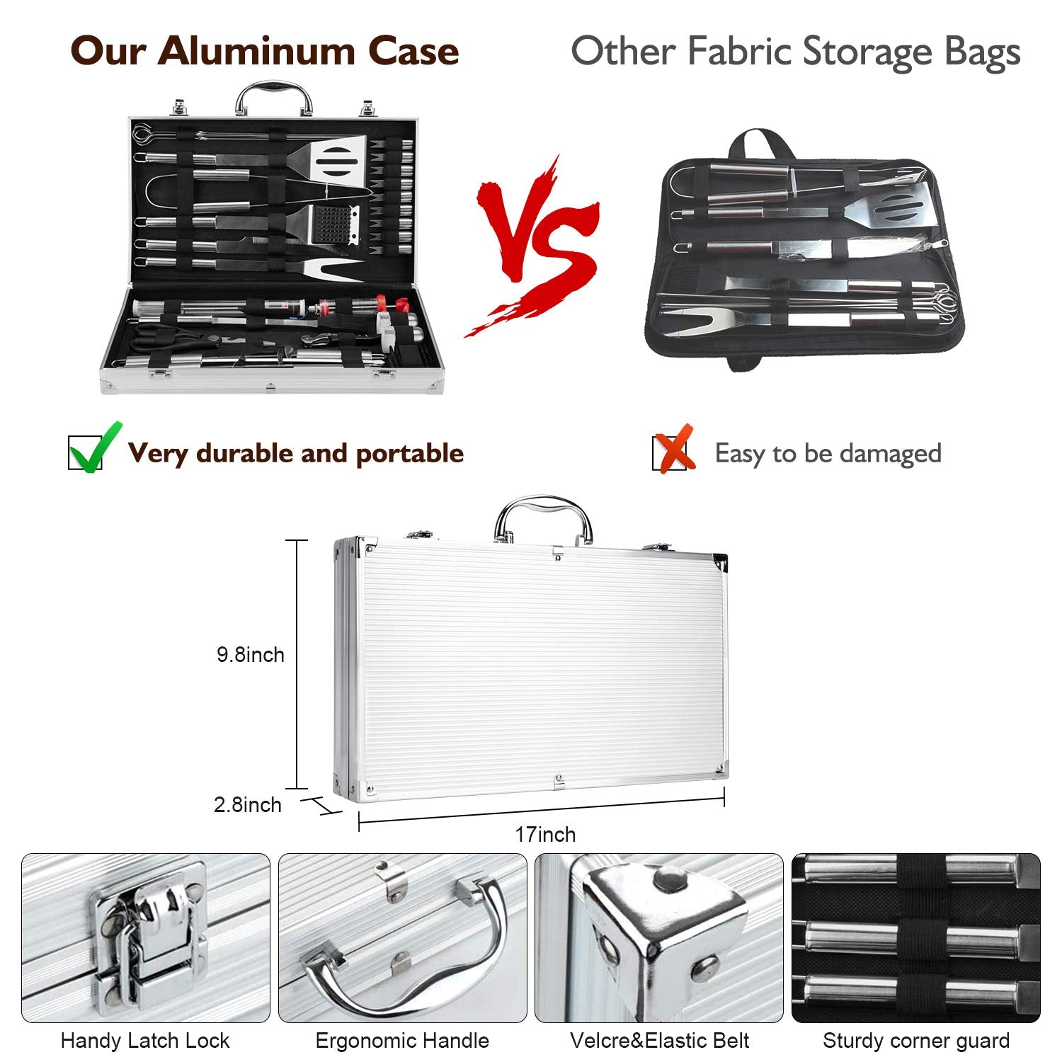 - 【Portable and Convenient Aluminum Case】Birald grill tools set comes with a delicate aluminum case for easy of storage and carry. The velcro locks each tool in a neat position, so you could easily keep all the barbecue tools neatly organized and get better protected in the portable aluminum case. The lightweight aluminum case is easy to carry which is ideal for camping or picnic.