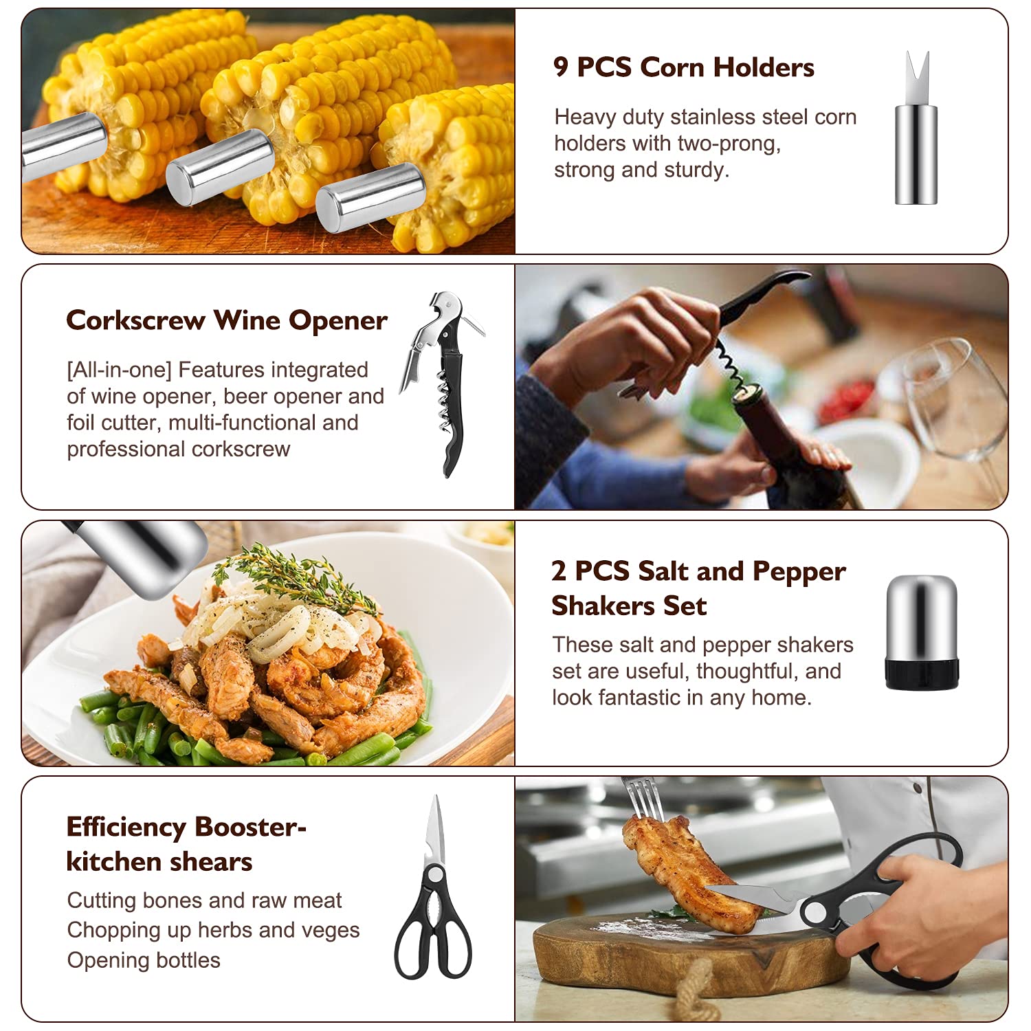 - 【Complete Bbq Tool Set】Birald 34pcs convenient grill tools set comes with all the essentials you need for backyard barbecues and camping cookouts. It includes long-handled grill tongs, spatula, fork, meat knife; basting brush, grill cleaning brush, extra grill brush head , 2 grill mats, meat thermometer, meat injector, 2 pepper & salt shakers, 9 corn holders, 8 skewers, grill glove, kitchen shears, grill tongs, corkscrew, aluminum case.
