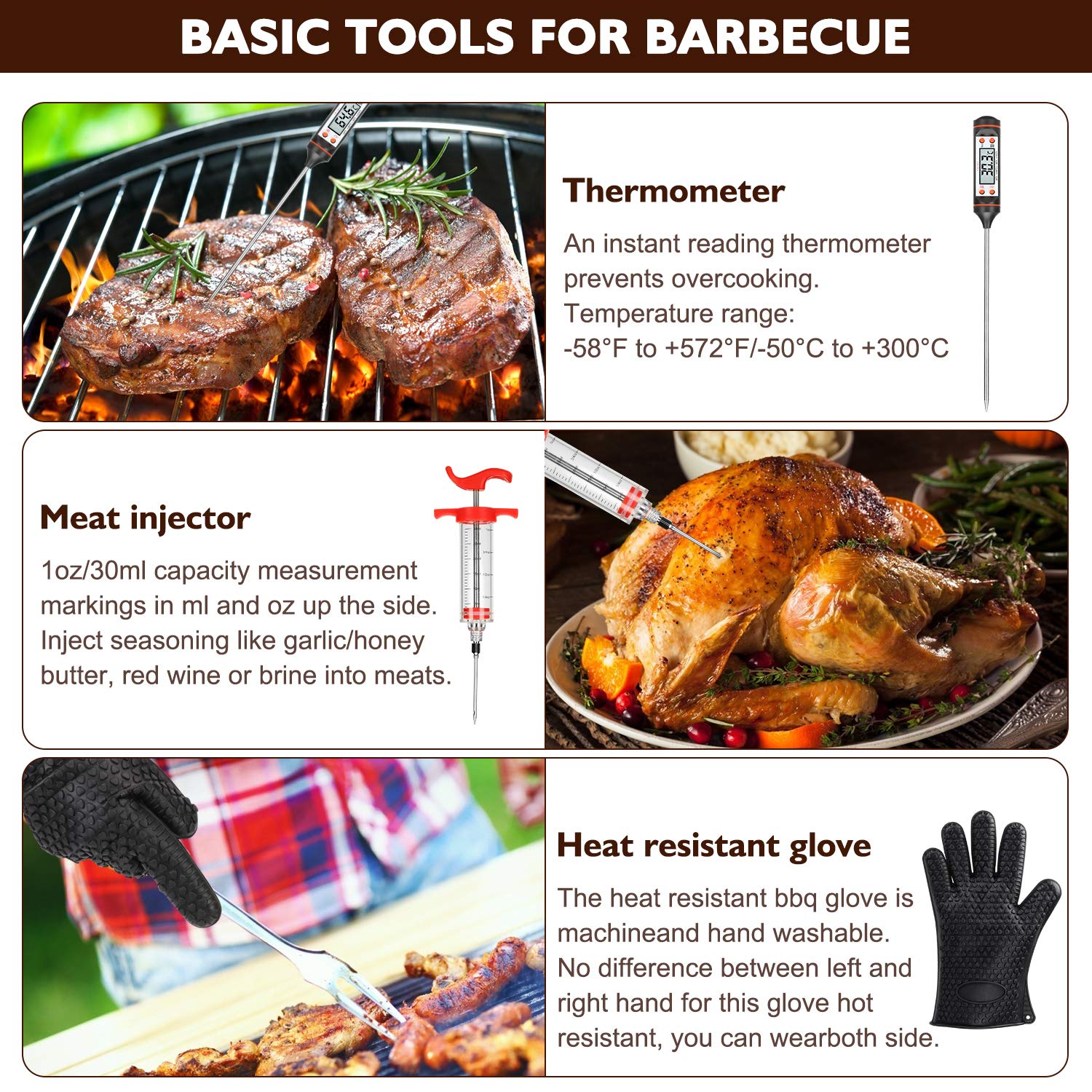 - 【Versatile Cooking】Besides the commonly found versatile tools, this kit comes with many useful items. It includes an instant read thermometer for preventing people from over-cooking their meat; 2 grill mats for cooking delicate meats like fish while preventing food from sticking to the grill; a BBQ brush for cleaning the grill after it has cooled down; a kitchen shears for cutting bones and raw meat and chopping up herbs and veges, makes kitchen prep work easier.