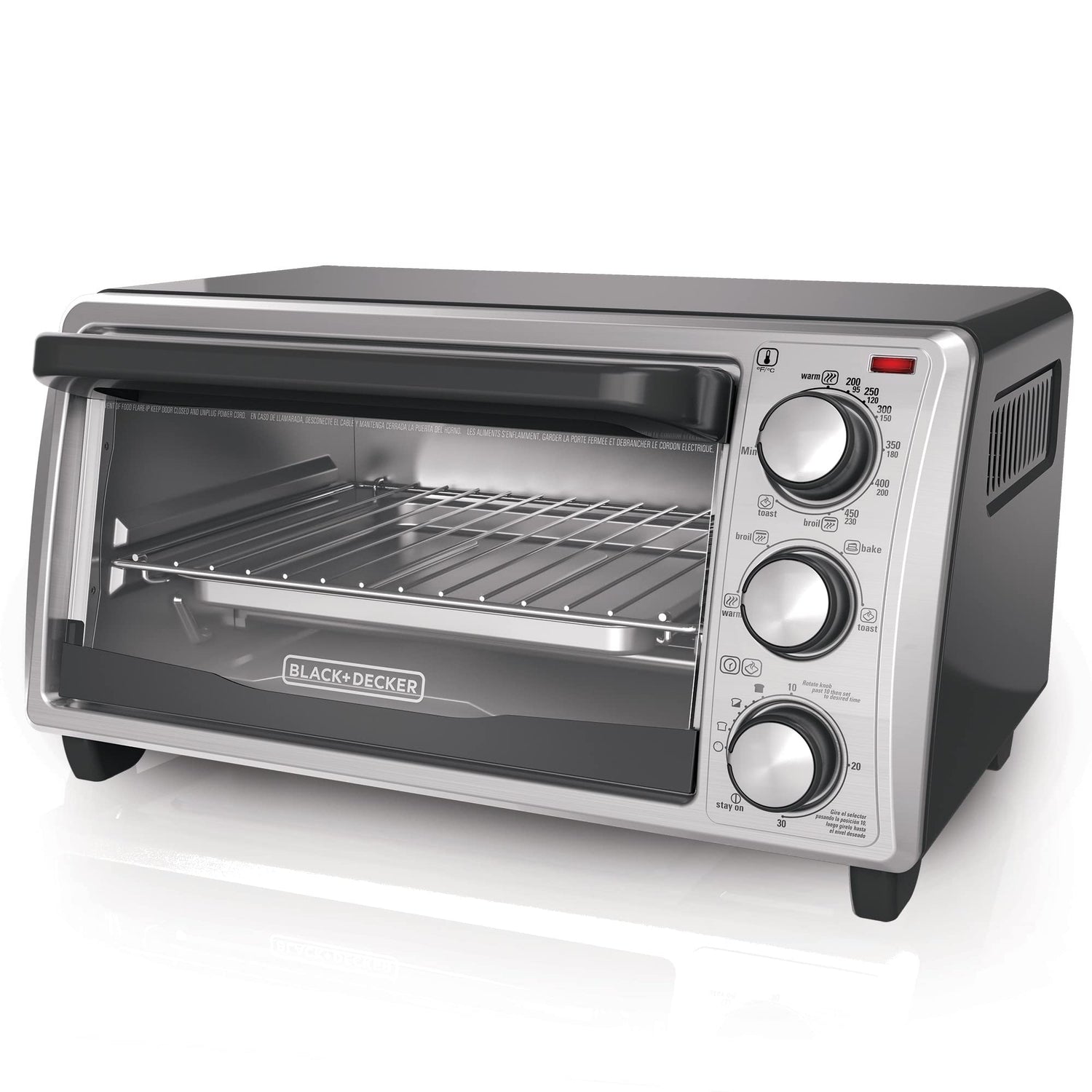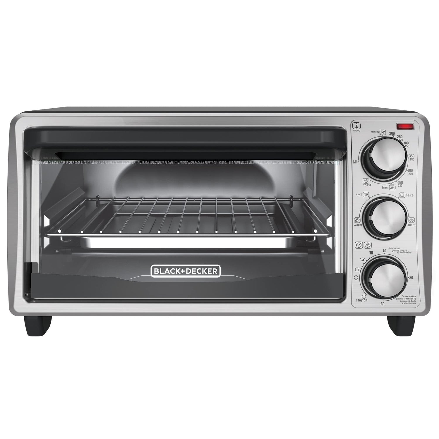 Details: Large enough for a 9” pizza or four slices of bread, the BLACK+DECKER 4-Slice Stainless Steel Toaster Oven with Broiler Pan complements any kitchen countertop. This compact, versatile toaster oven bakes, broils, toasts, and keeps food warm, at up to 450°F. It comes with a baking and broiler pan that fits perfectly into the small toaster oven interior. Plus, our exclusive EvenToast Technology optimizes heat distribution to toast bread evenly. When it’s time to eat, trust the #1 brand in toaster ovens*—BLACK+DECKER. Large viewing window keep an eye on food during cooking. The durable glass window gives you a clear view of food throughout the cooking process. Bake/broiler pan don’t worry about finding pans to fit in the oven. The included baking/broiling pan fits perfectly, making it easy to insert and remove food. Toasting rack also included.