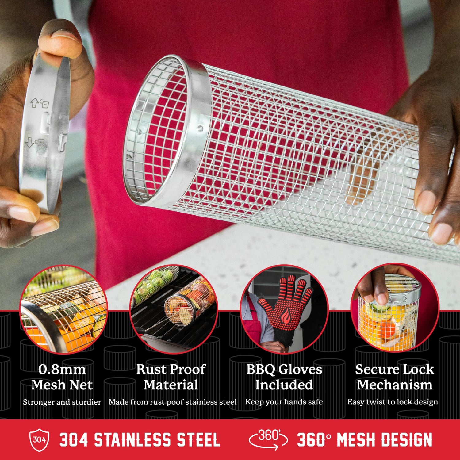 • 【ENGINEERED FOR DURABILITY & PERFORMANCE】Crafted from premium 304 stainless steel, our round grill nets are built to last, making them the strongest and most reliable grilling companions on the market. Don't settle for flimsy grilling baskets that bend & wear out after a few uses. The 0.8mm thick cylinder mesh ensures that your delicious food stays intact while allowing those mouthwatering grill marks to sear through to perfection.