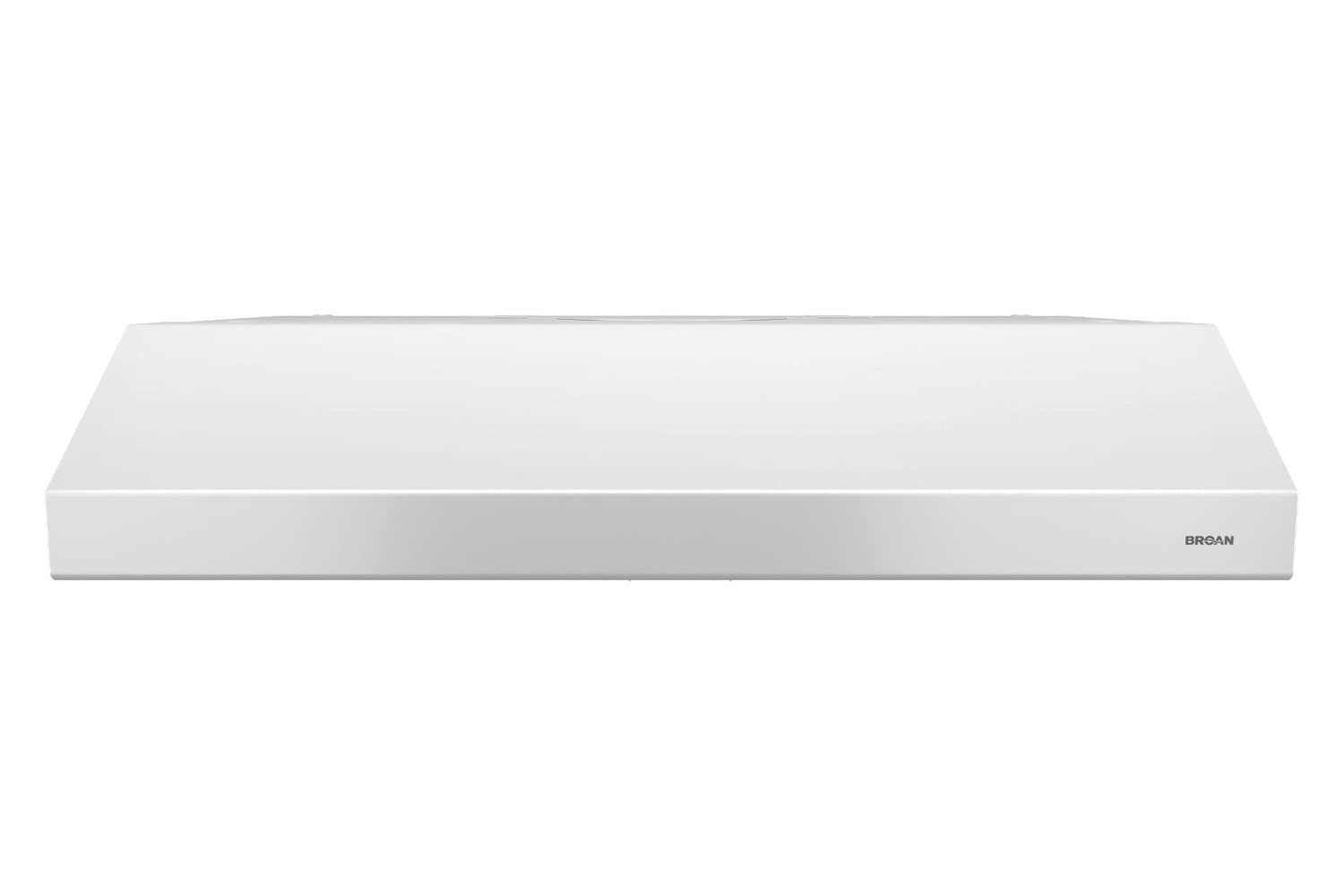 Details: Upgrade your kitchen with the Broan-NuTone Glacier 30-inch Under-Cabinet Convertible Range Hood! This versatile range hood insert offers a complete solution to your ventilation needs by providing both an exhaust fan and overhead light for your stove. This range hood provides a MAX 300 CFM and 5.0 Sones blower performance to quickly remove smoke and cooking odors from the air, and the hidden 2-speed rocker switch allows for quick fan adjustments and provides the ideal level of ventilation every time you cook. It also features the Captur system - an advanced blower design with a forward positioned centric inlet to remove 98.5% of smoke and odors faster. The 2-level built-in lights accept up to 50-watt halogen bulbs (not included) to evenly illuminate your cooking area, and they are also controlled by a hidden rocker switch for ease of use. This sleek white-colored steel range hood fits neatly underneath cabinets, and it features mitered sides and a hemmed bottom with no sharp edges to help ensure safety and provide a more decorative look. The two one-piece dishwasher-safe open mesh grease filters offer easy cleaning so you can maintain optimum grease capture and keep your kitchen ventilated. This 4-way convertible range hood unit measures 19.625" x 30" x 6" and installs as 3.25" x 10" ducted opening connected vertically or horizontally with damper, 7" round vertical ducting (damper sold separately), or as non-ducted with air recirculation (filter sold separately) to provide versatile installation options at least 18" above the cooktop. It includes hidden louvers on top of the hood that exhaust away from the cabinetry. It can work in an ADA-compliant application as well. It is both UL-Listed and HVI-2100 Certified for safety and protection, and it includes a 1 year limited warranty. Enhance your kitchen with the Broan-NuTone BCSD130WW Range Hood!