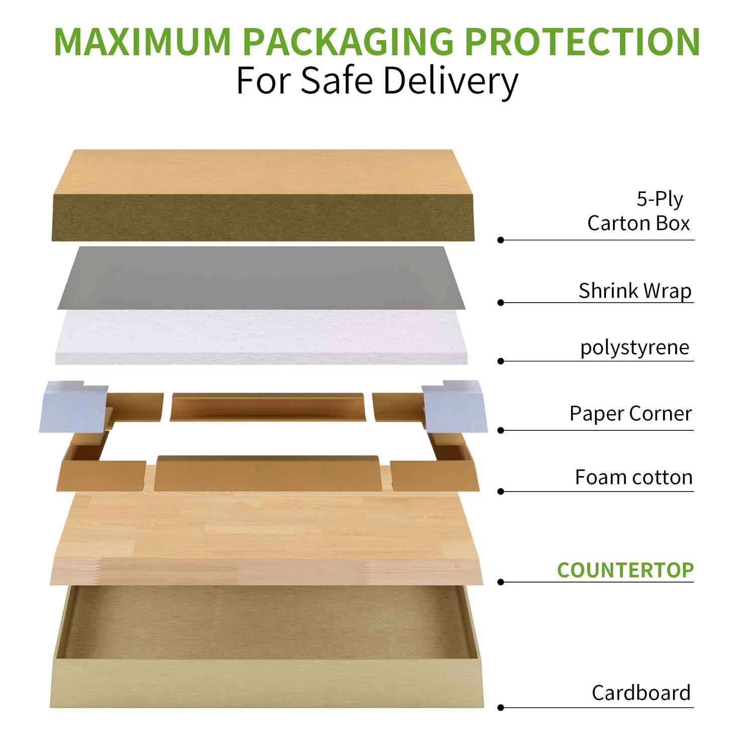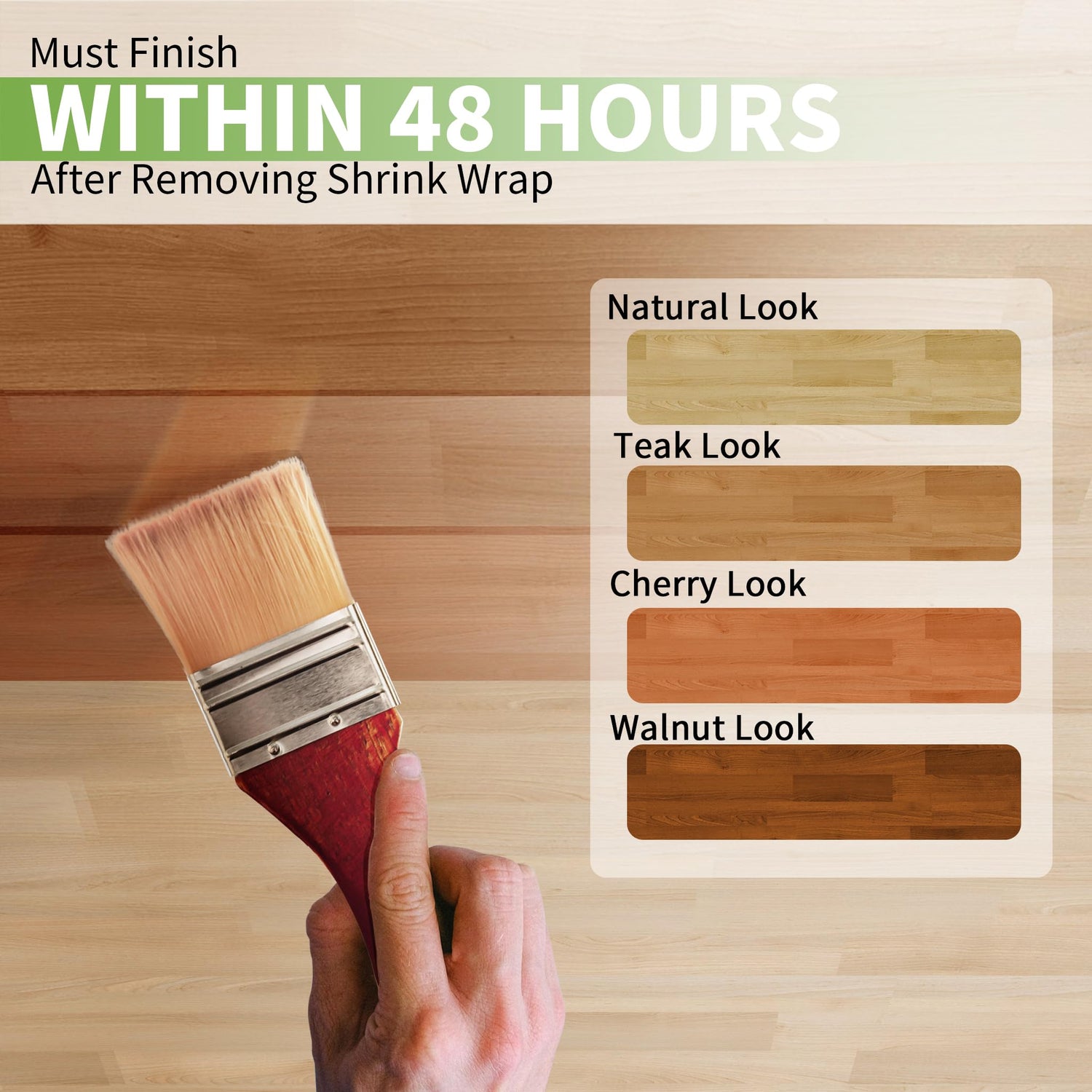 - COUNTERTOP: The wood slabs for the tabletop are unfinished and require further sanding and sealing. Apply two coats of oil (e.g., mineral oil or hardwax) within 48 hours of removing plastic to protect against water damage, drying, warping, and cracking