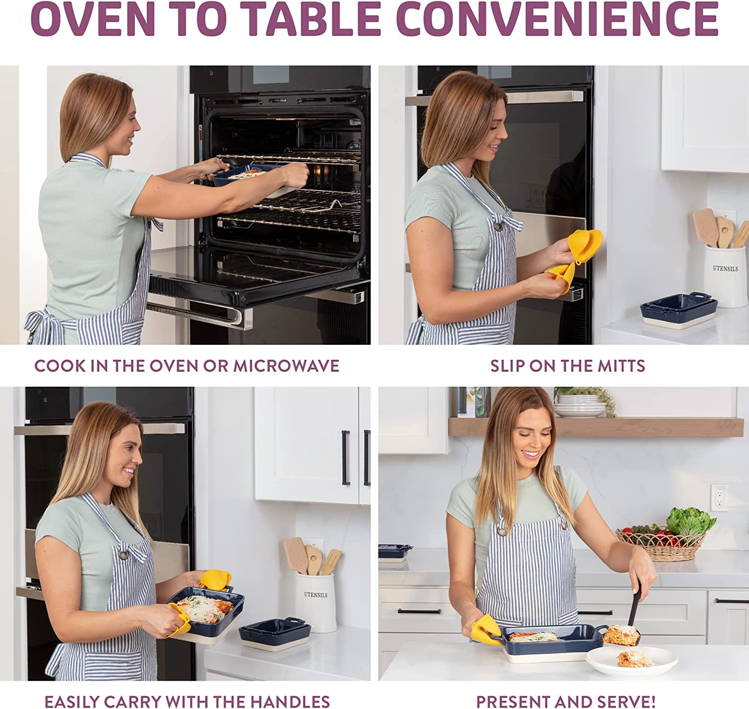 - Easily Carry from Oven to the Table: Convenient handles and included silicone oven mitts make it easy for this stoneware casserole set to go straight from the oven to your dining table, and the stunning two-tone navy blue and cream glaze finish makes an attractive presentation for serving your dinner guests