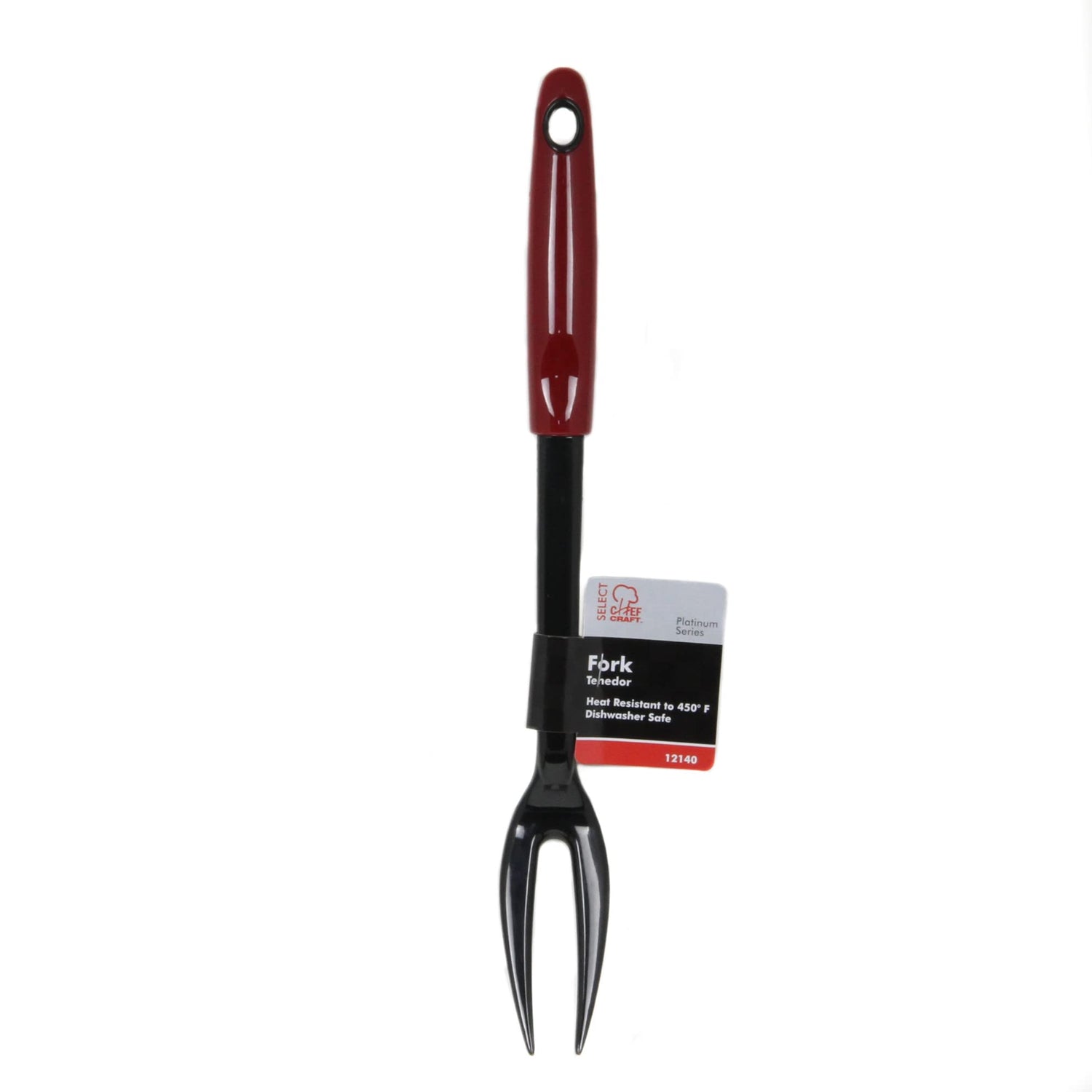 Details: Chef Craft's Select Red Nylon Fork is great for turning meat on the grill and serving. Nylon construction resists high temperatures. It has an ergonomic handle for ease of use and is comfortable to use. The nylon withstands temperatures up to 450 degree fahrenheit. It does not scrap nonstick coatings. The fork has a hole in the handle for easy storage. Dishwasher safe for an easy and convenient cleaning.