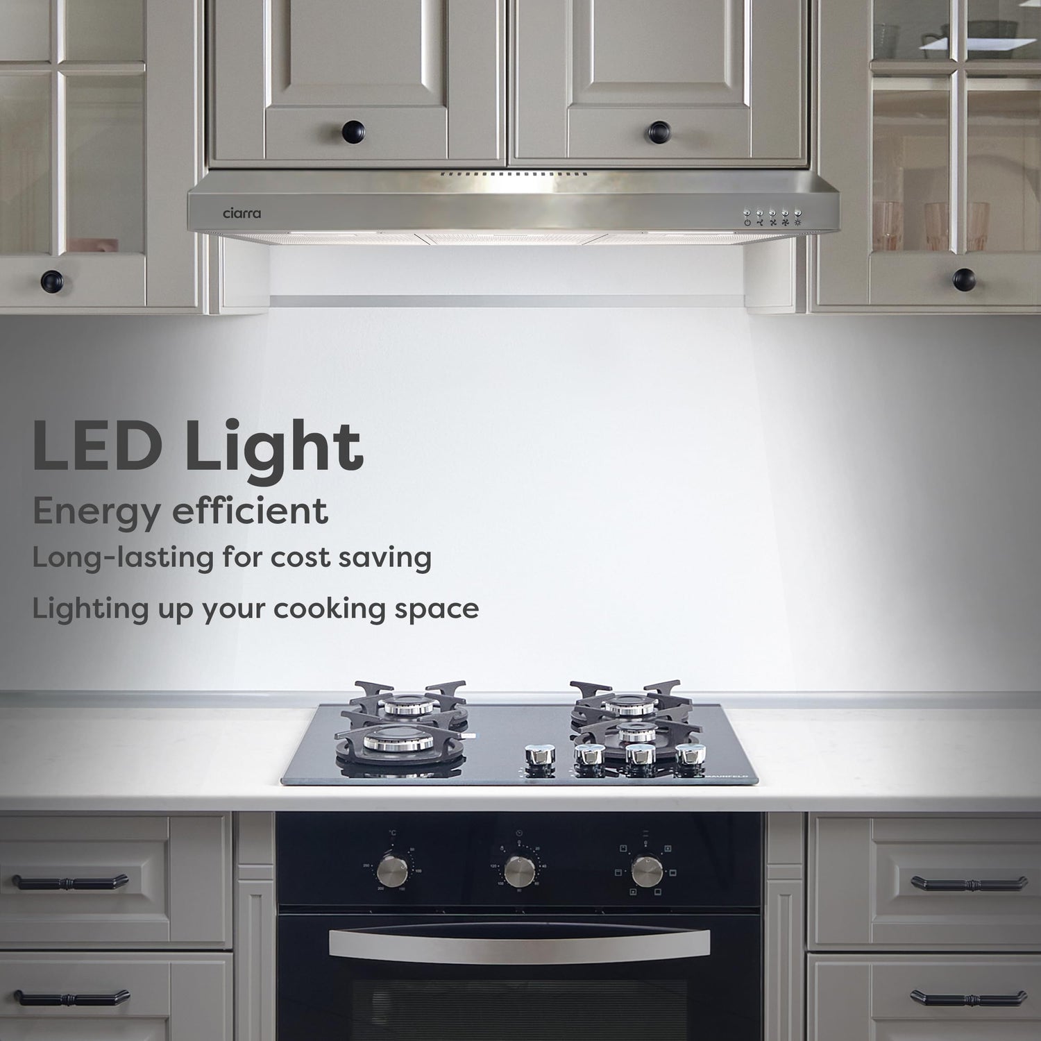 - BRIGHT LIGHTS:With 2 pcs bright cooking lights on the both side of stove hood vent, whether you cook on the left or right, illuminating your kitchen workspace.