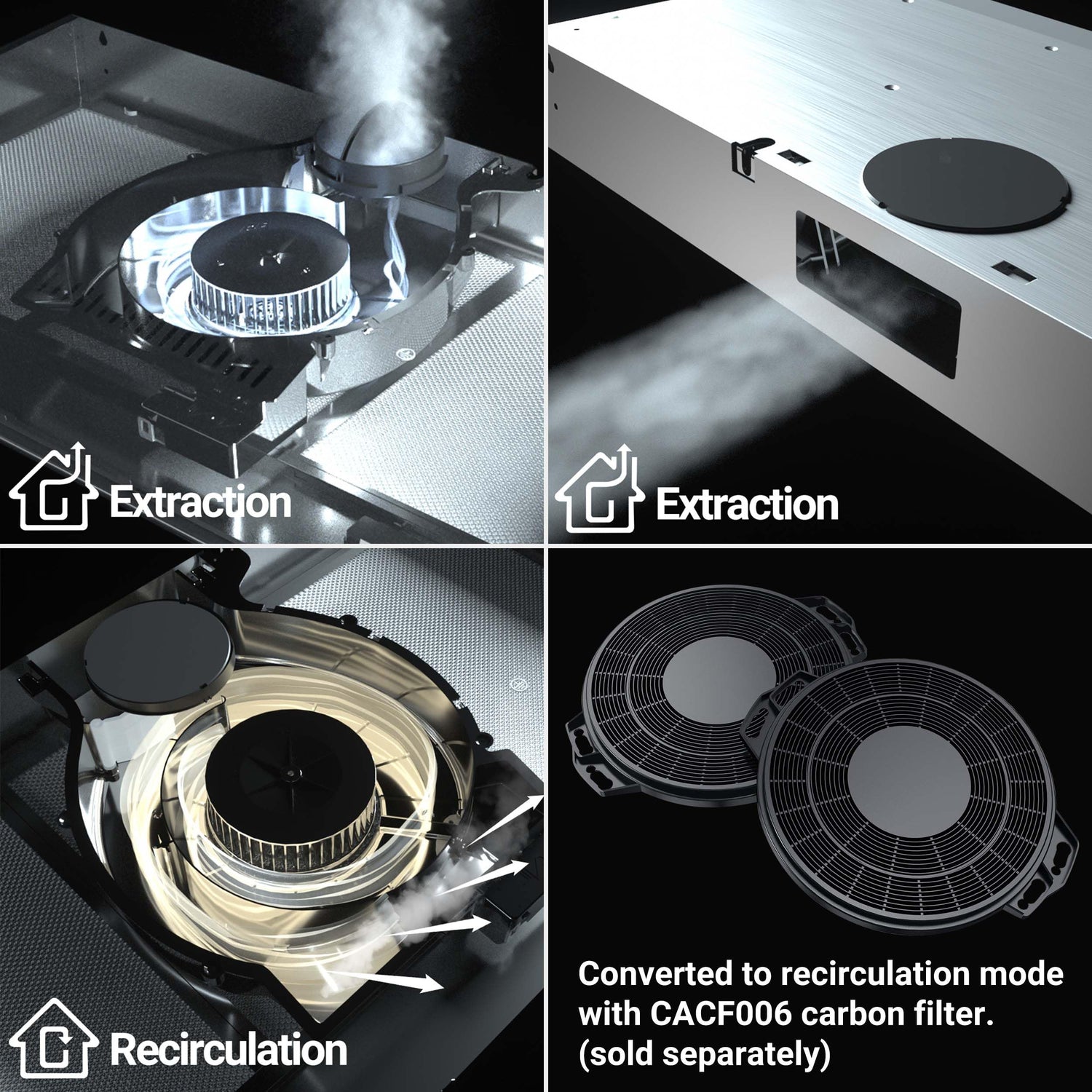 - CONVERTIBLLE VENTILATION MODE: The kitchen exhaust hood in stainless steel can be converted with ducted or ductless. Ductless mode need to operation with the optional purchase of CACF006 carbon filter for recirculating.