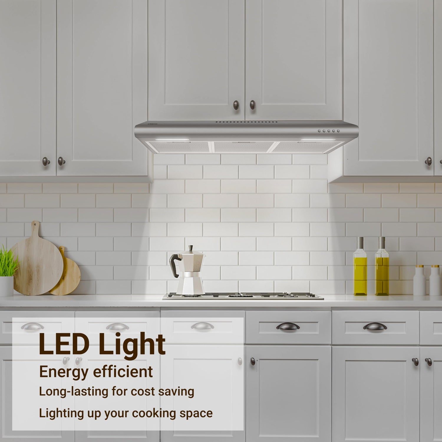 - USER-FRIENDLY DESIGN: Range hood 30 inch with mechanical push button for convenient control. Quiet operation, 6.5 Sones max at the highest speed.