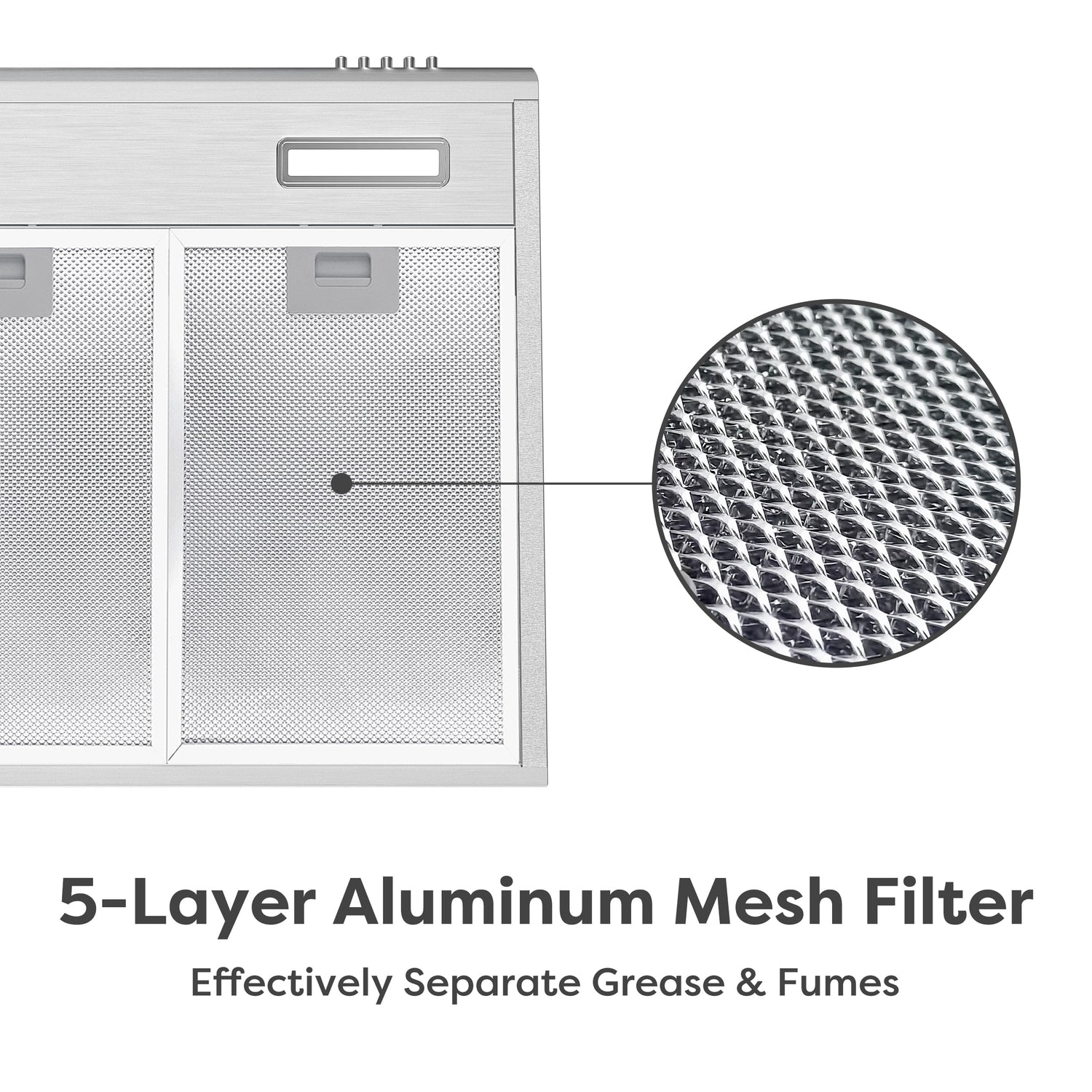 - SUPERIOR FILTRATION: Ductless range hood with 5-layers mesh filters, trap cooking grease and oil with ease, preventing smells and odors spreading in your kitchen.