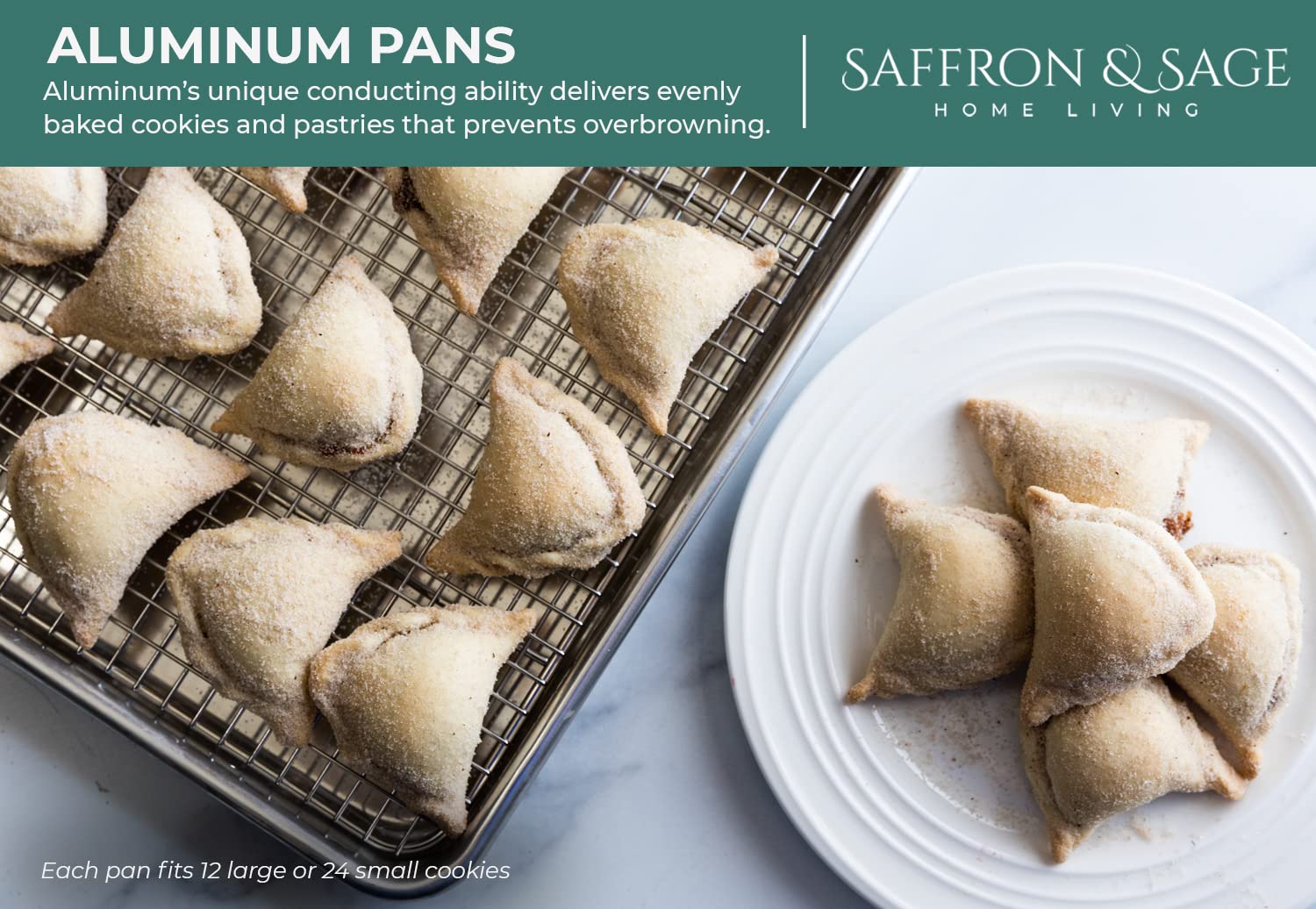 - Unlike other pans for baking that are too thin and warp, or have a coating that peels and rusts, the Saffron & Sage baking tray is made of a thick aluminum gauge with a reinforced steel rim to withstand temperatures of up to 500ºF / 260ºC without twisting or warping. Its metal surface has no teflon or other coatings added, therefore this half sheet pan and rack will not peel or rust, making them long lasting.