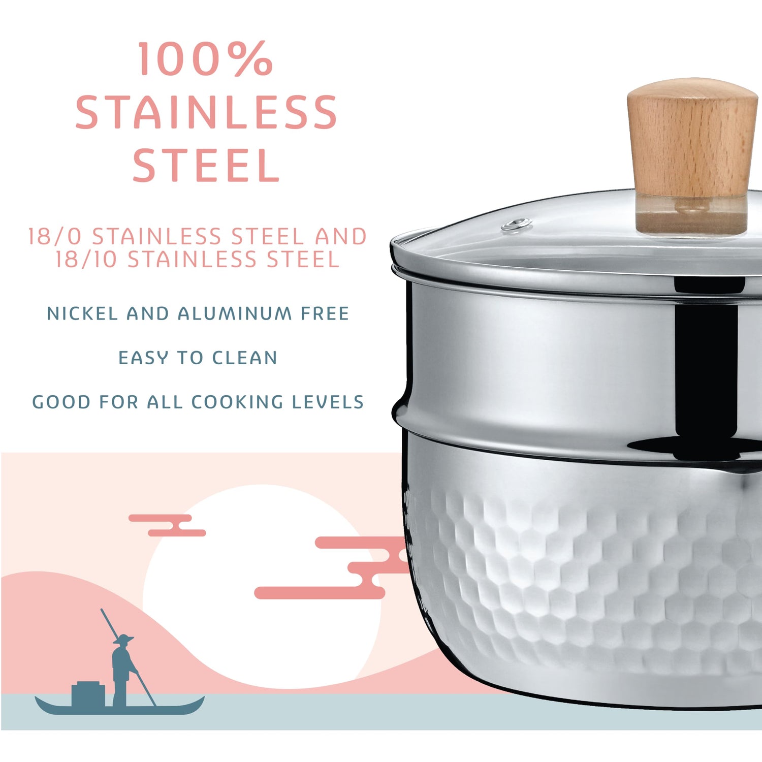 - 18/0 Stainless Steel is nickel free and naturally induction compatible. Heats up extremely fast and is great for ramen, tempura, milk, sauces, syrup, and so much more!