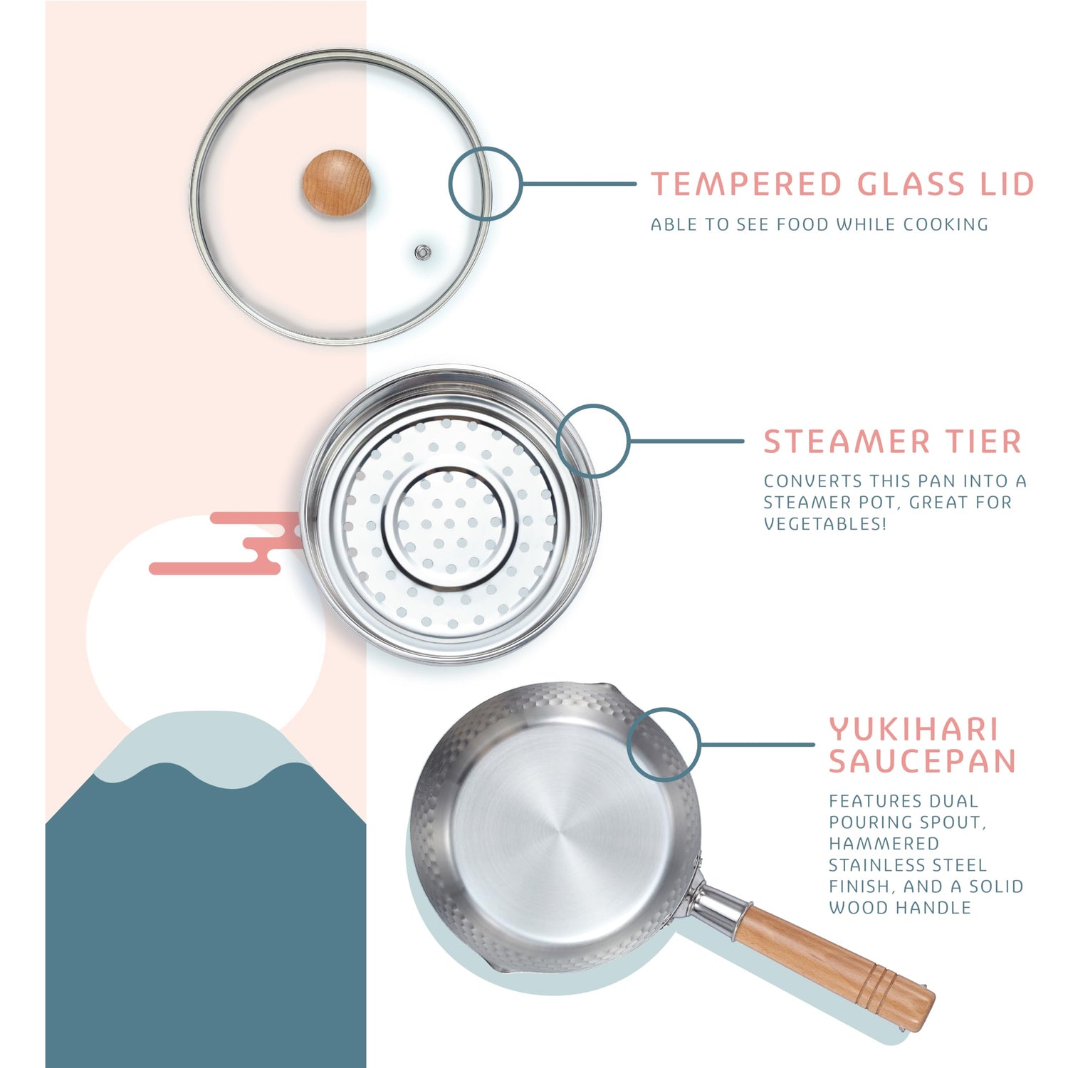 - This Yukihira Japanese cookware features a dual pouring spout, so you can pour on either side of the saucepan. Add on the steamer tier to covert this pan into a steamer pot, Great for Vegetables! Tempered glass lid so you can see the contents you are cooking.