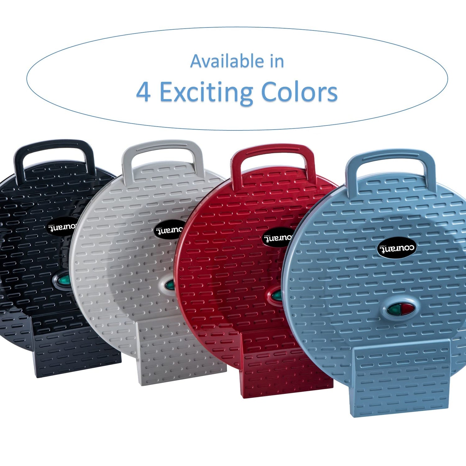 The 12” diameter cooking area features cooking plates on the top and bottom for even cooking throughout and provides a delicious crispy crust. Non-stick coating on baking plates make it easy to wipe clean after every use and helps eliminate any gooey leftovers.