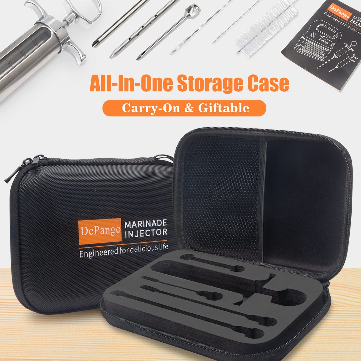 - Versatile Storage Bag, Easy To Carry --> Come with an elegant DePango zipped storage bag for easy carry food injection syringe; Enough container space to store both BBQ injector kit and your other barbecue accessories; Convenient to carry for outdoor garden grill, patio bbq smoking party; Perfect idea for your family and friends, like Birthday, Easter Day, Mother’s/Father’s Day, Thanksgiving Day, Christmas Holiday