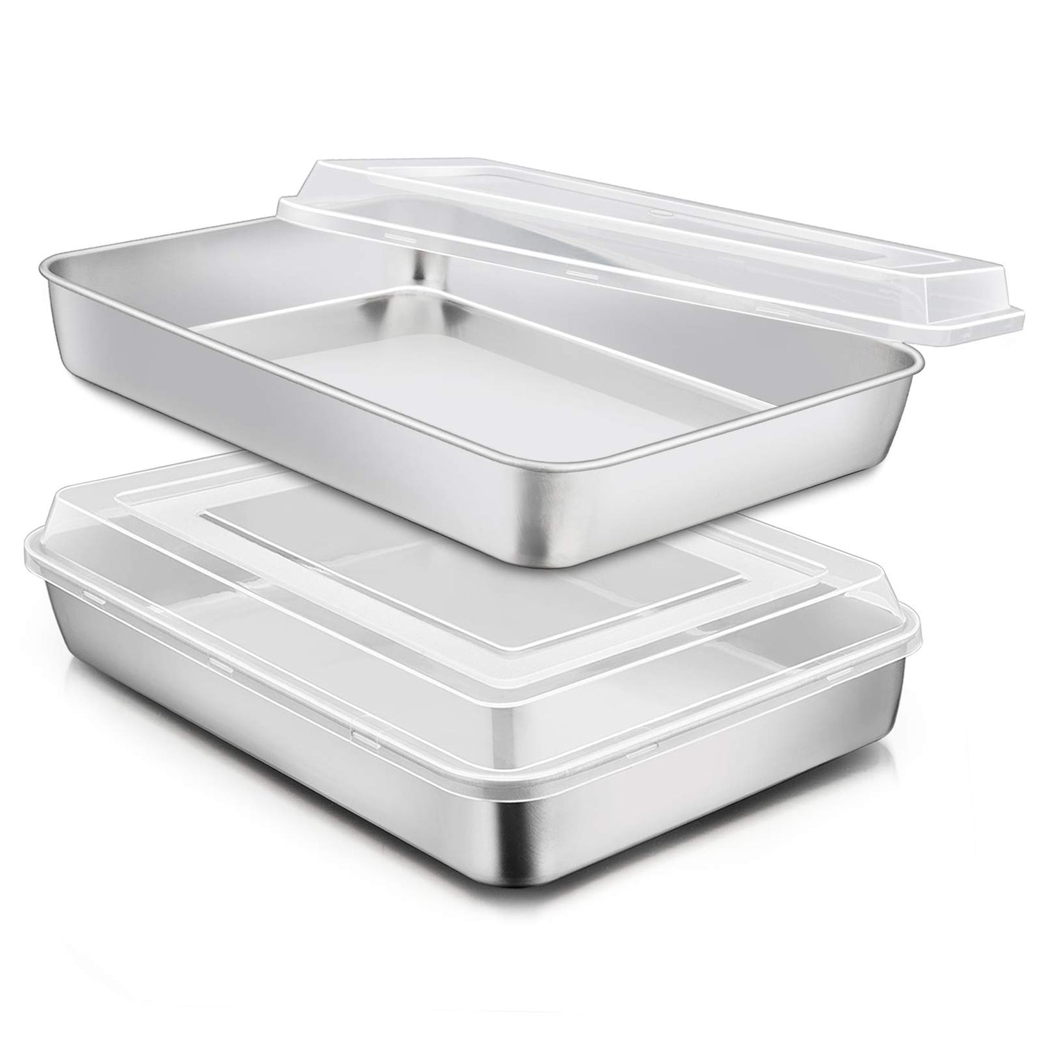 E-far Stainless Steel Baking Pan with Lid, 12⅓ x 9¾ x 2 Inch Rectangle Sheet Cake Pans with Covers Bakeware for Cakes Brownies Casseroles, Non-toxic & Healthy, Heavy Duty & Dishwasher Safe - Set of 2