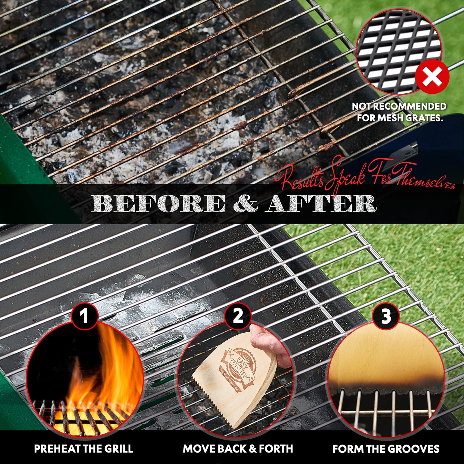 - Grill Scraper With QuickClean Tech - Molds to your grill grates shape and deeply cleans them.