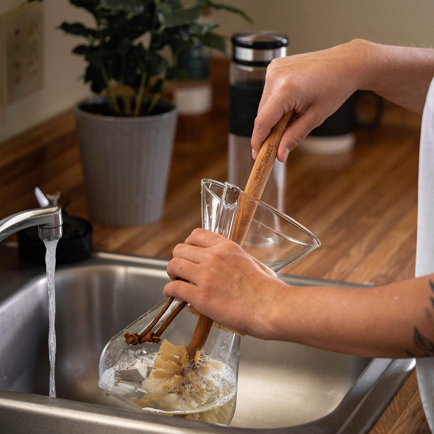 - Vegan Sisal Hemp Bristles – Very strong bristles that maintain shape and structure to remove tough smoothie or coffee stains. Does not contain animal products like horsehair bristles that fade over time and aren’t ethically sourced. Ideal for wide mouth bottles
