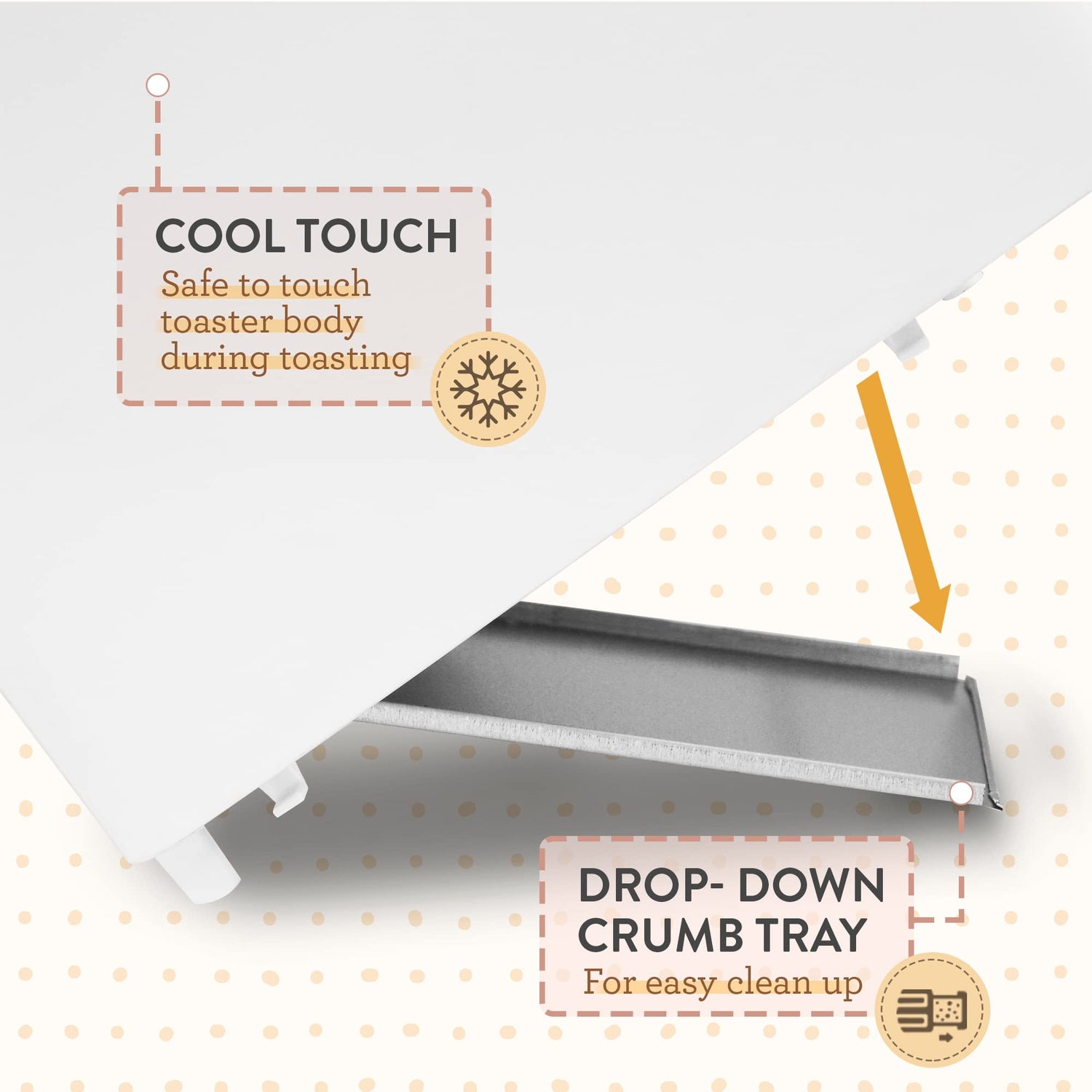 - COOL TOUCH: With easy to use push-down toasting lever and non-slip feet. The swing-out crumb tray has a simple wipe-away surface for quick cleaning.