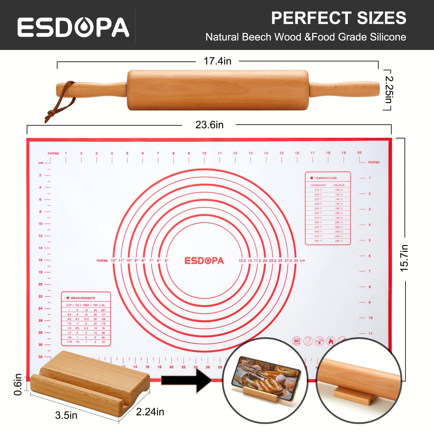ESDOPA Classic Wood Rolling Pin - Wooden Rolling Pins for Baking Silicone Mat Set, Dough Roller with Wood Base, Fondant Roller for Pie Crust Cookies Pizza Dough and Bread, 17 Inch