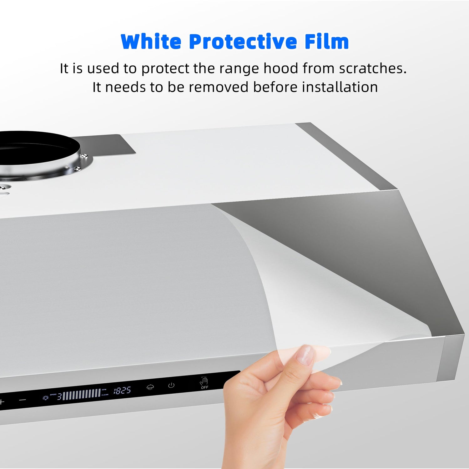 - Note: This product is a stainless steel range hood not a white range hood. The white protective film is used to protect the range hood from scratches. It needs to be removed before installation of the under cabinet range hood.