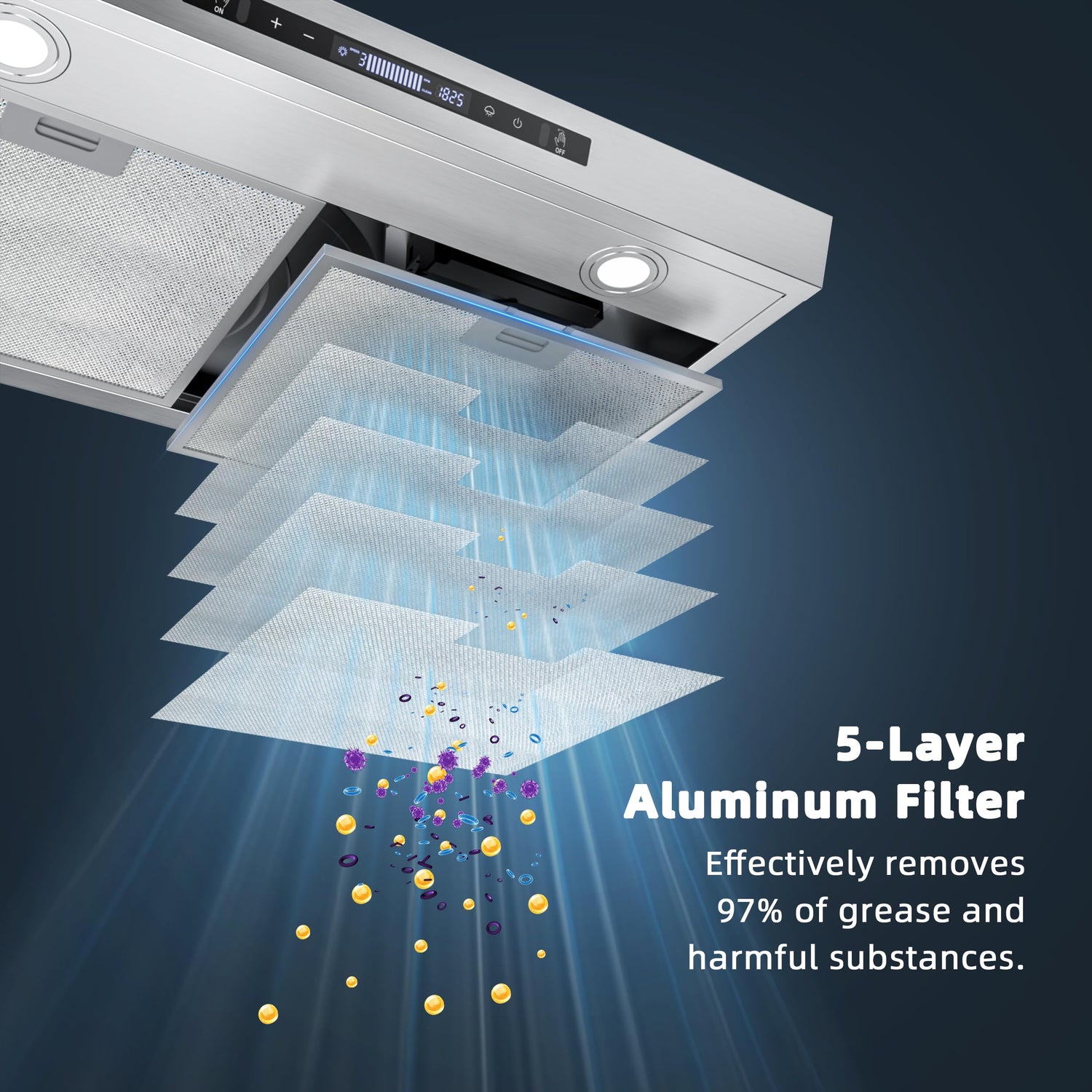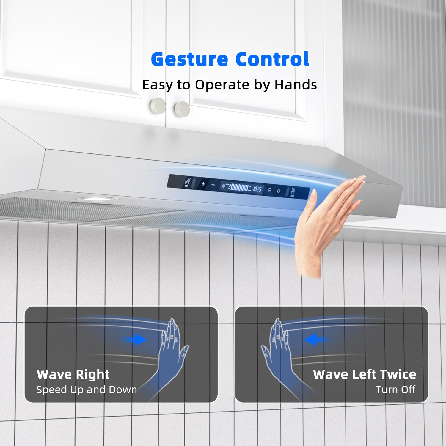 - TOUCH SCREEN / GESTURE CONTROL: In the touch screen panel, you can easily operate the on/off switch, 3 speed fan, 60 mins timer delay function and LED light. There is also a gesture switch function. It is very convenient to control the range hood by just waving your hand during cooking.