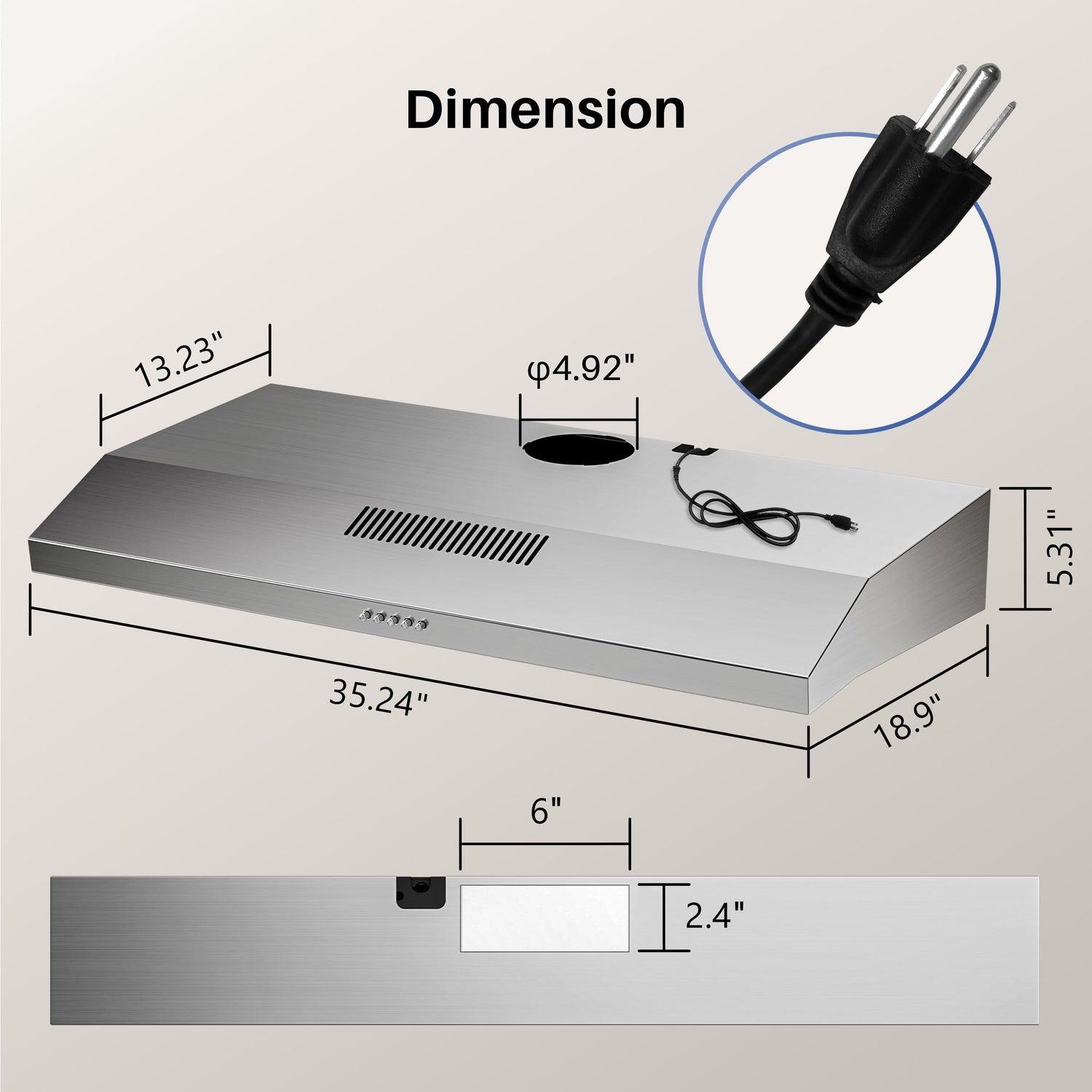 - 1 Year Limited Warranty And Friendly Service: Under cabinet range hood (comes with plug) dimension is 35.24"(W) x 18.9"(D) x 5.3"(H). If you have any questions about range hoods, please do not hesitate to contact us directly.