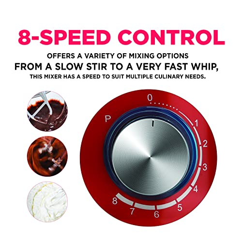 - 8 speeds & mixing guide; go from a slow stir to a fast mix, with exact control at each one; a helpful guide at the mixer’s top lets you know which speed to use for various mixing methods