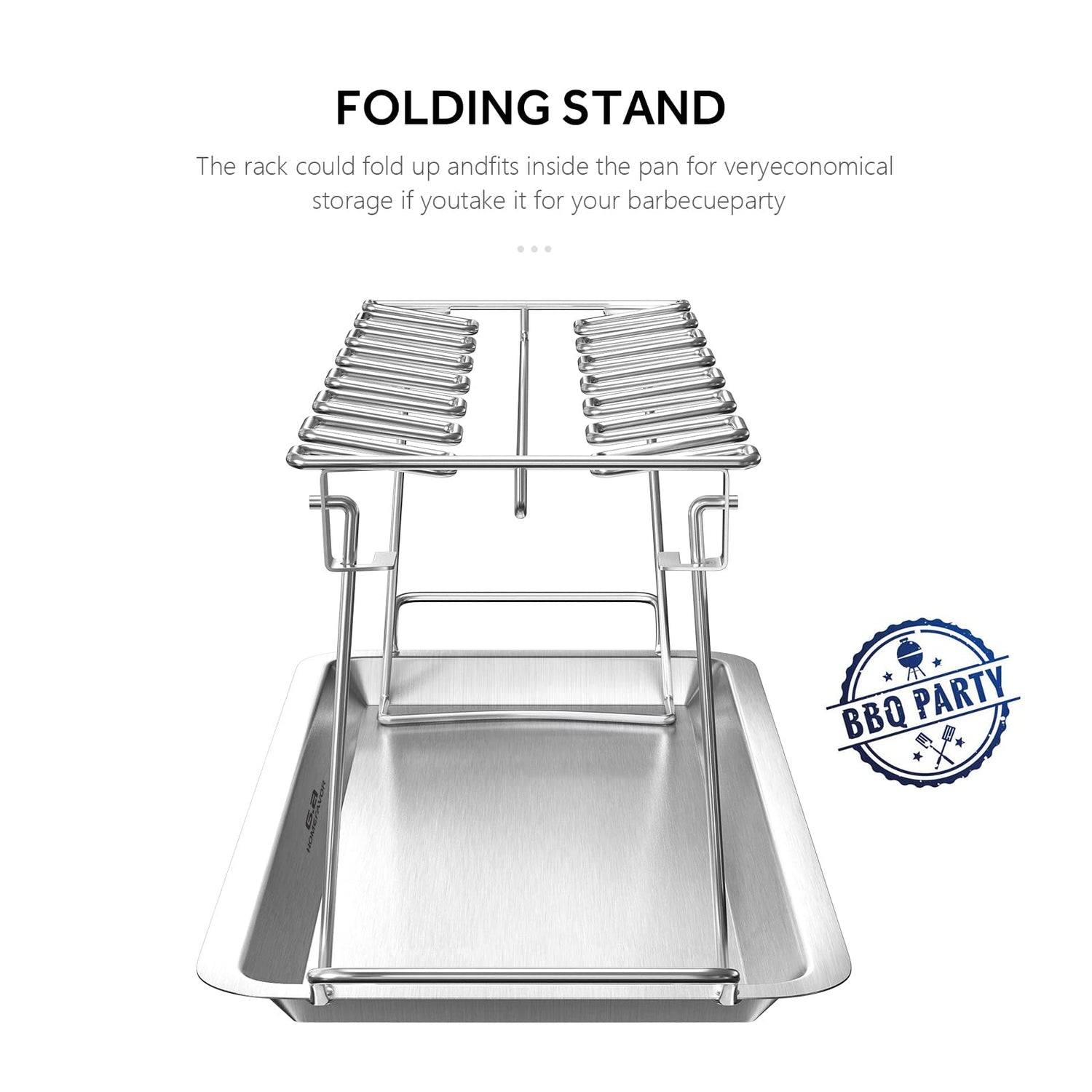 - FOLDING STAND: The rack could fold up and fit inside the pan for very economical storage if you take it for your barbecue party