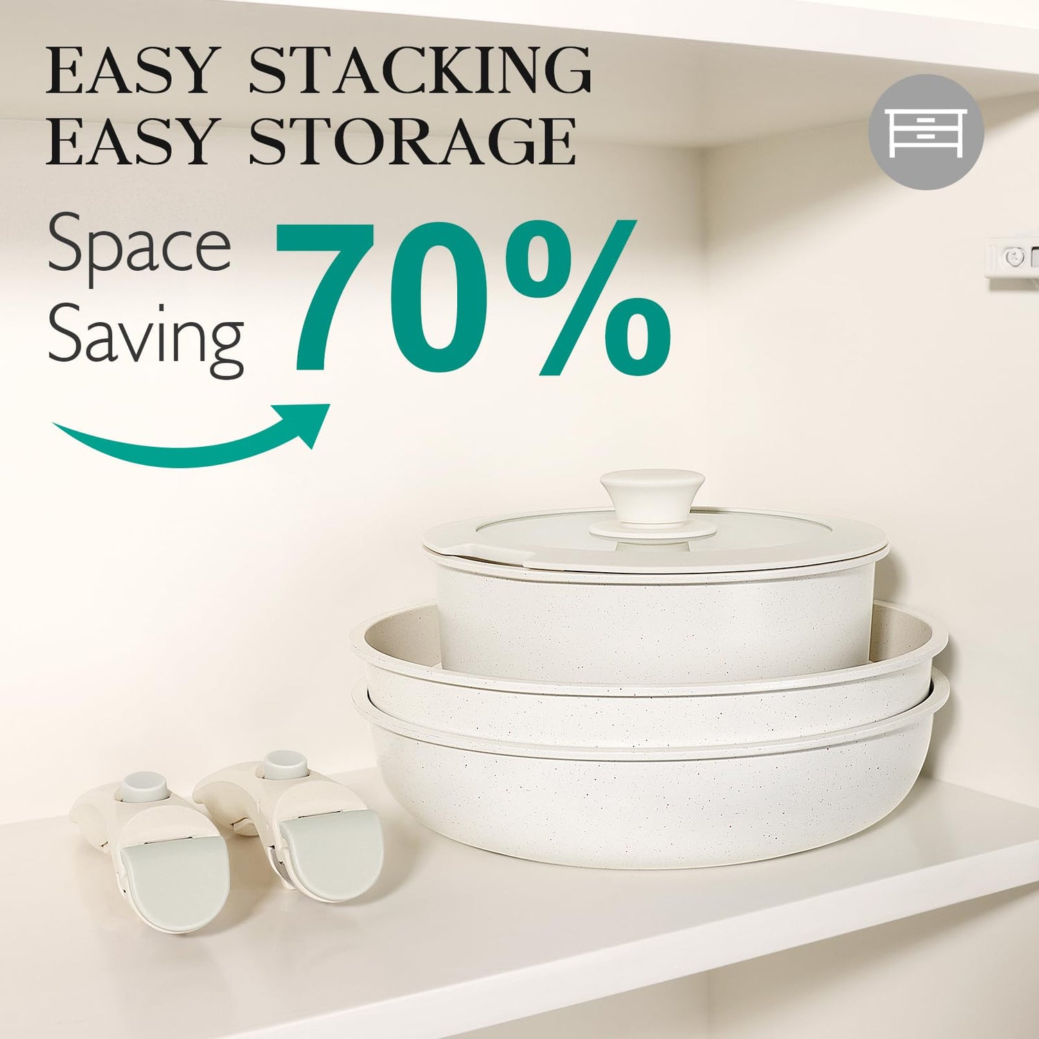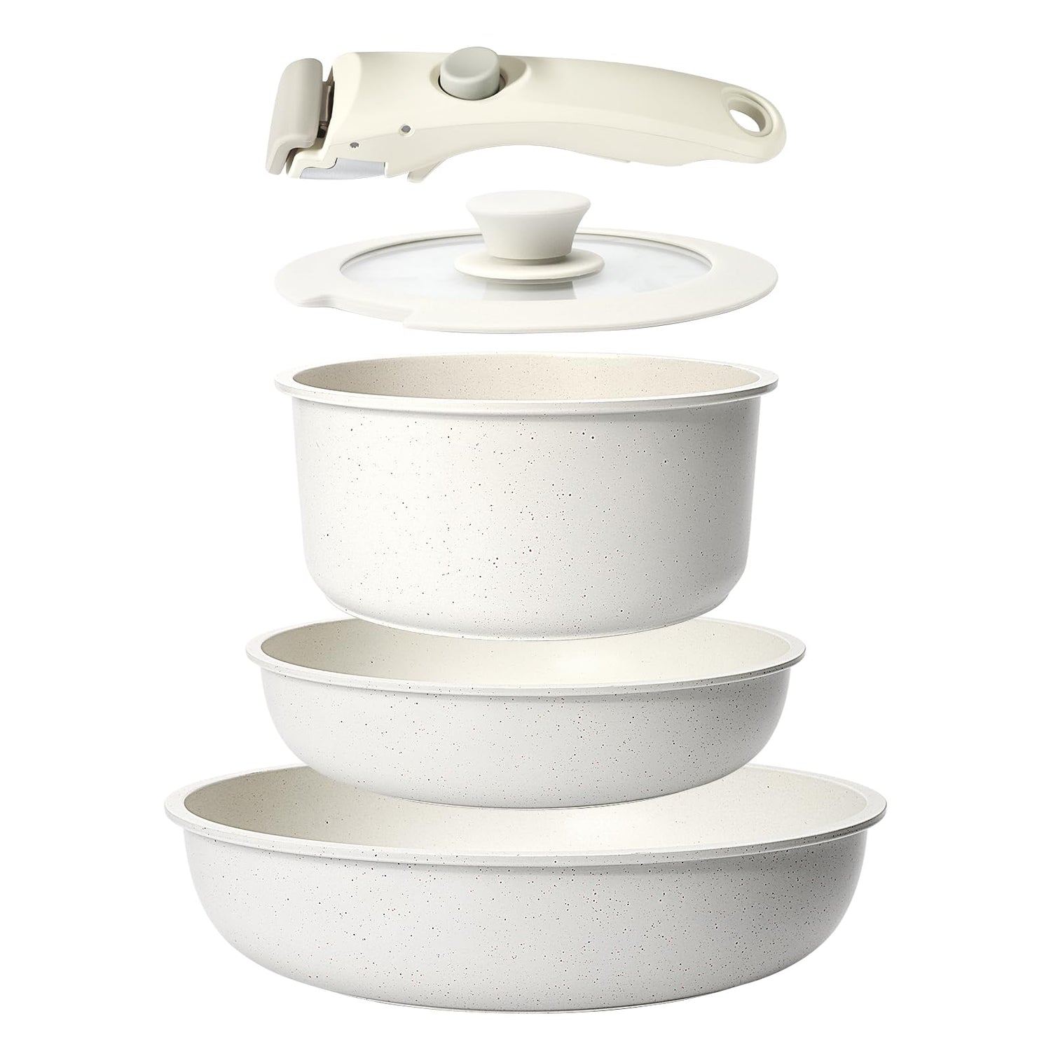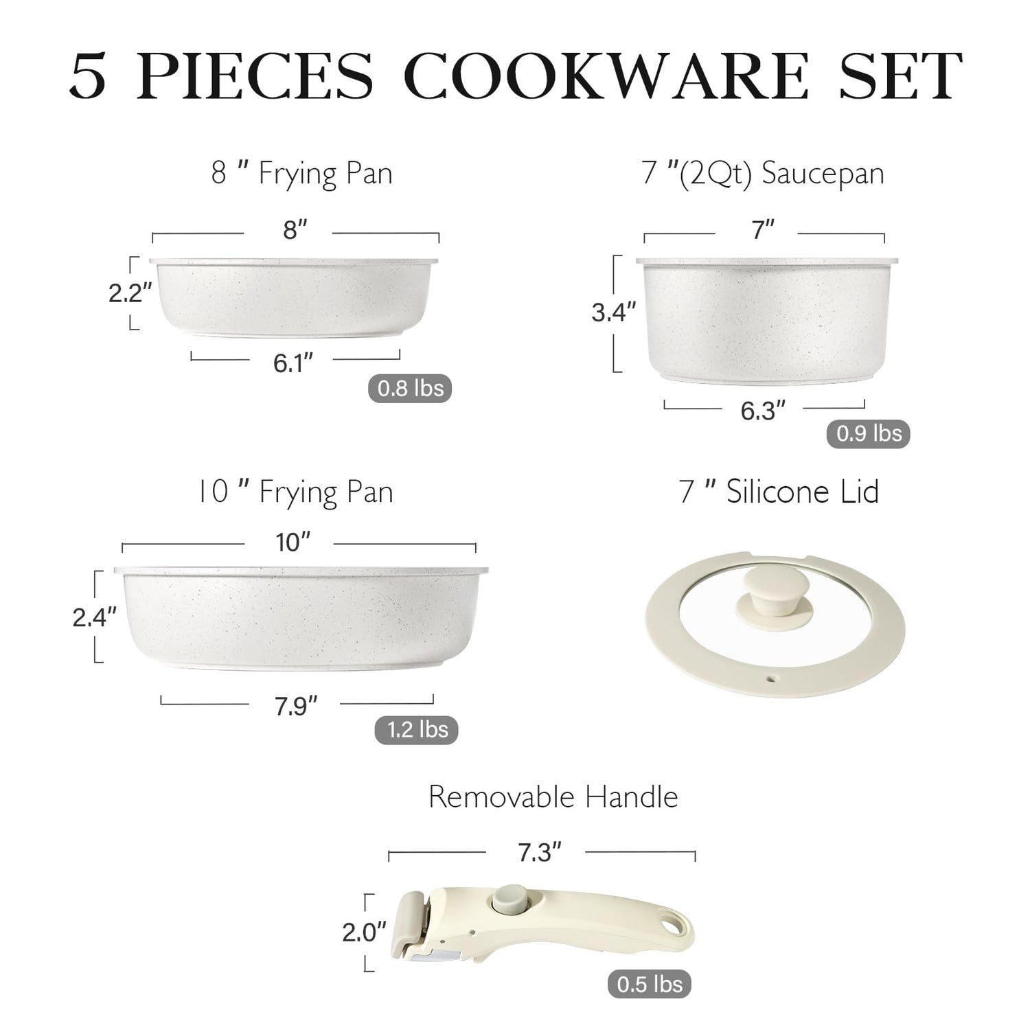 • ๐Ÿ“-๐๐ข๐ž๐œ๐ž ๐‚๐จ๐จ๐ค๐ฐ๐š๐ซ๐ž ๐’๐ž๐ญ ๐ˆ๐ง๐œ๐ฅ๐ฎ๐๐ž๐ฌ: 8"/10" inch frying pan, Removable Handle*1, 2Qt saucepan and 7" silicone Lid