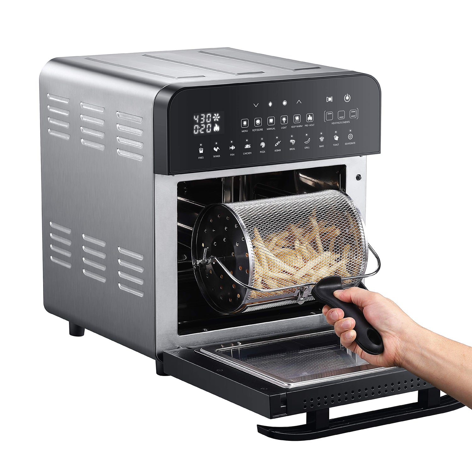 Details: Introducing the 14. 7 Quart Ultimate Air Fryer Oven Grill. It was designed with a high-quality stainless steel interior AND body and comes with 11 accessories to maximize your cooking potential. Air Fry, roast, rotisserie, bake, dehydrate, and even grill! Enjoy new dual heating elements, cutting your cook time heating from all sides. Use the included heavy-duty cast aluminum grill plate to grill meats and veggies to perfection from the comfort of your kitchen.