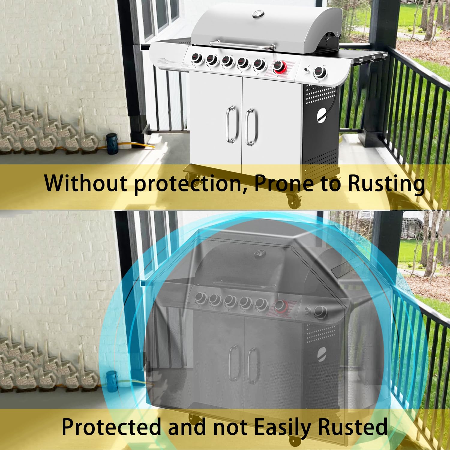 • 58 Inch Grill Cover made with oxford cloth material, No matter what the weather, this BBQ Cover will protect your Grill from Heavy Wind, Rain, Storms, Sun, Dusty, Snow and UV.