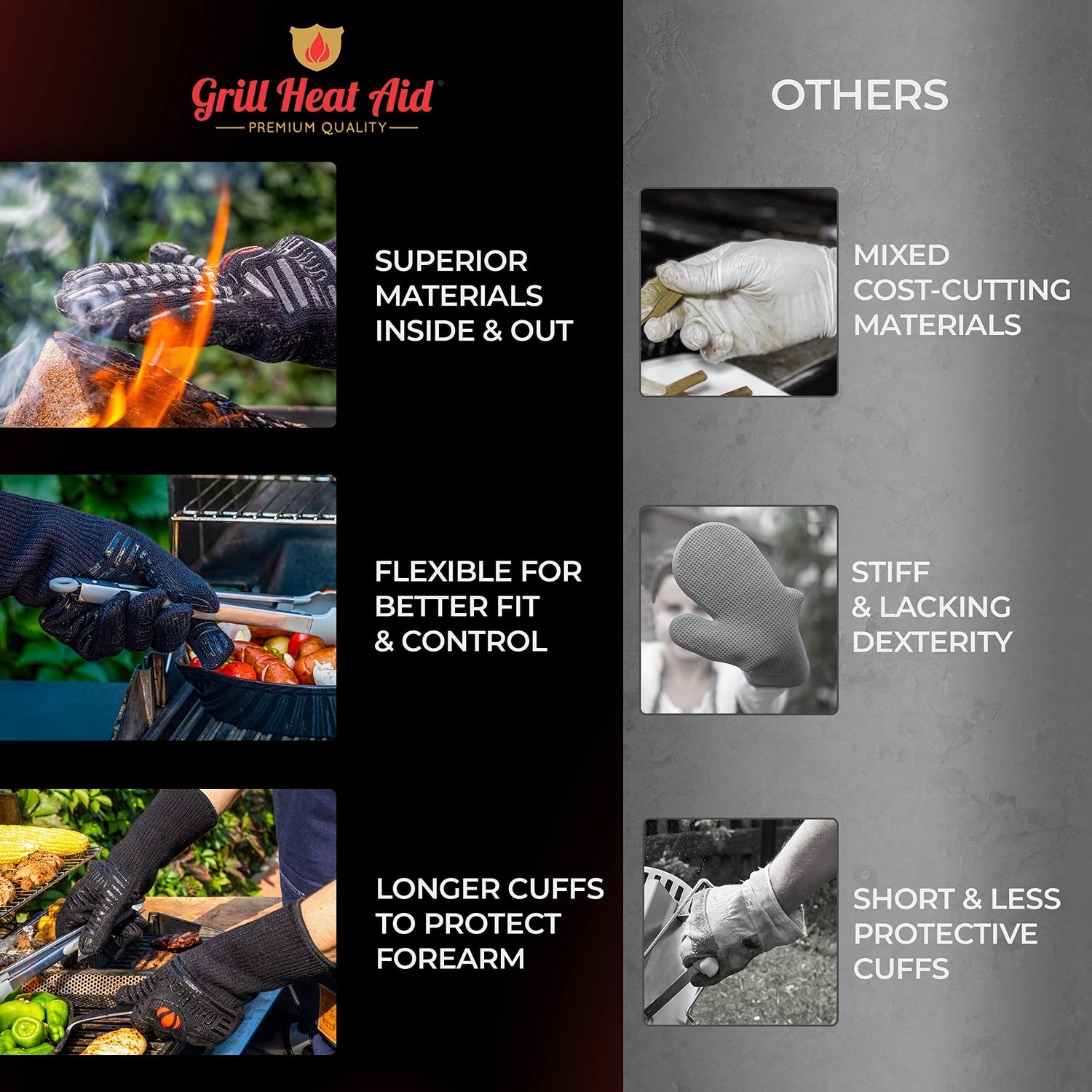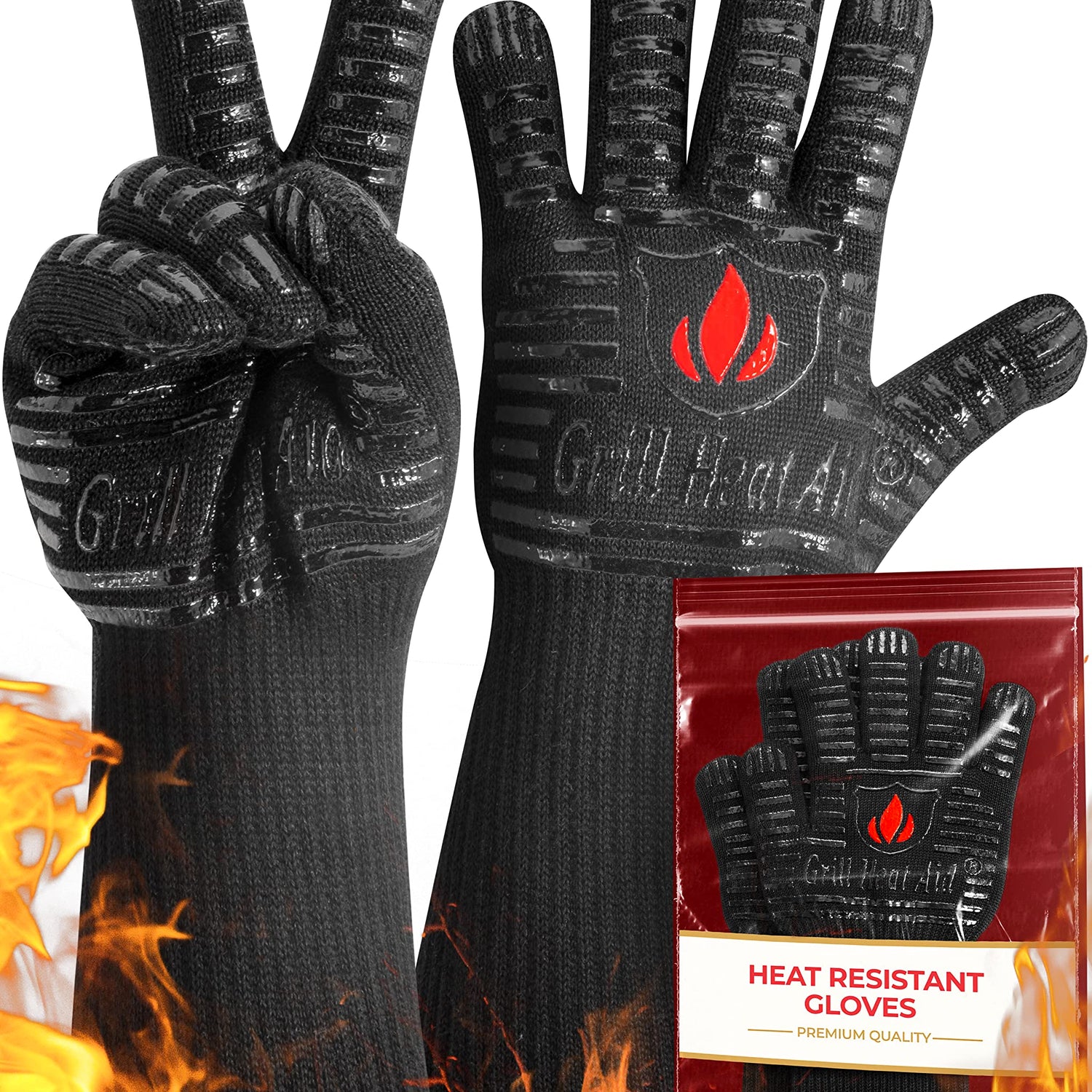 GRILL HEAT AID Premium BBQ Gloves - 1472°F Heat Resistant Gloves for Grilling, Longer Cuff Grill Gloves Heat Proof for Men, Oven Mitts for Baking, Pizza, Barbecue, Cast Iron, Fire Pit, Fireplace