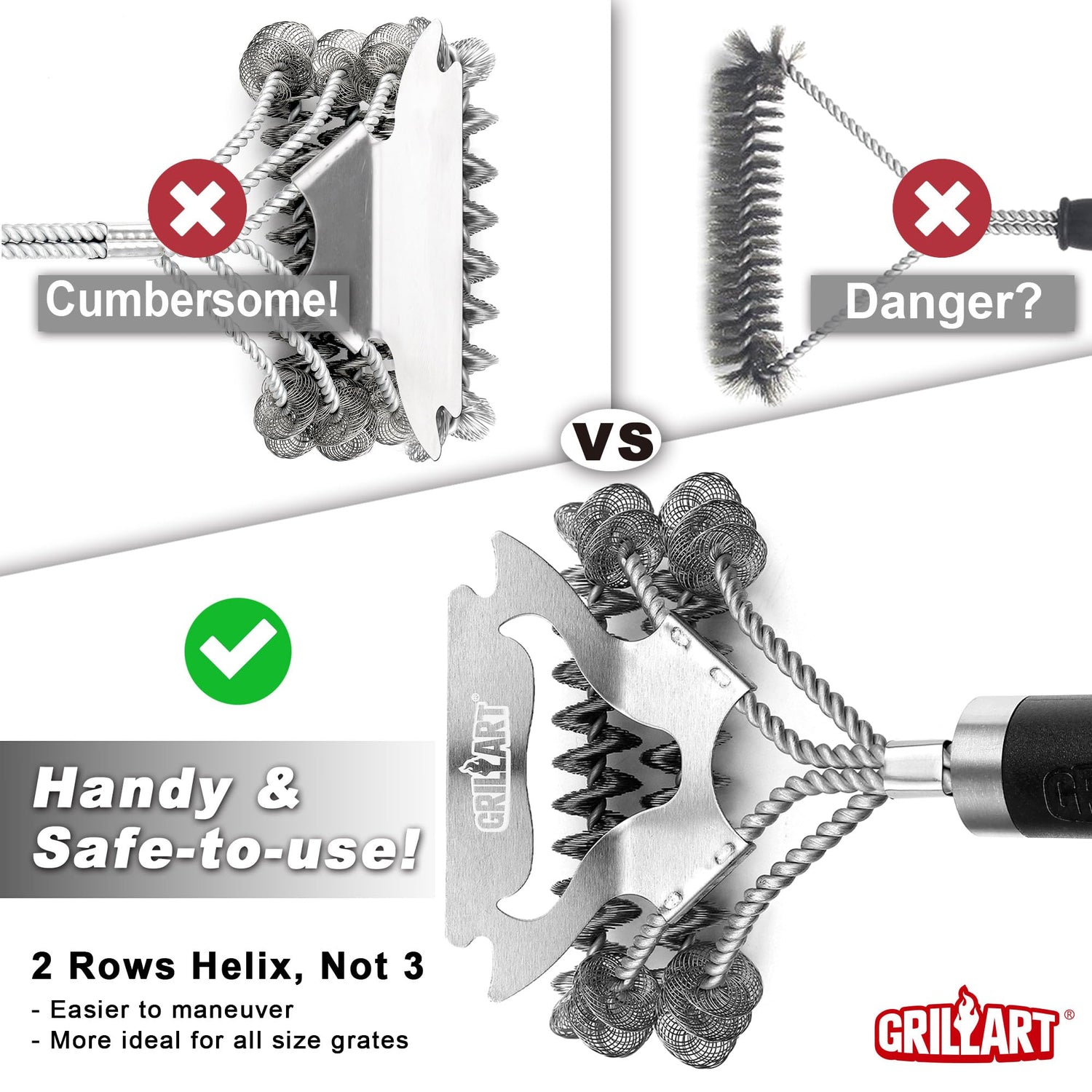 - 【Handy to Use - Double helix, Not Three】: Compared with the common 3-layer helix design, our 2-layer maybe better for you. 2-layer means lighter weight and smarter size, you can clean both large & small grill more easily as there’s no extra weight or bulky size to hinder your cleaning progress, and ultimately make your cleaning more laborious. A good BBQ brush should exist for your ease of use, rather than sacrificing its due convenience in pursuit of the so-called larger cleaning area;