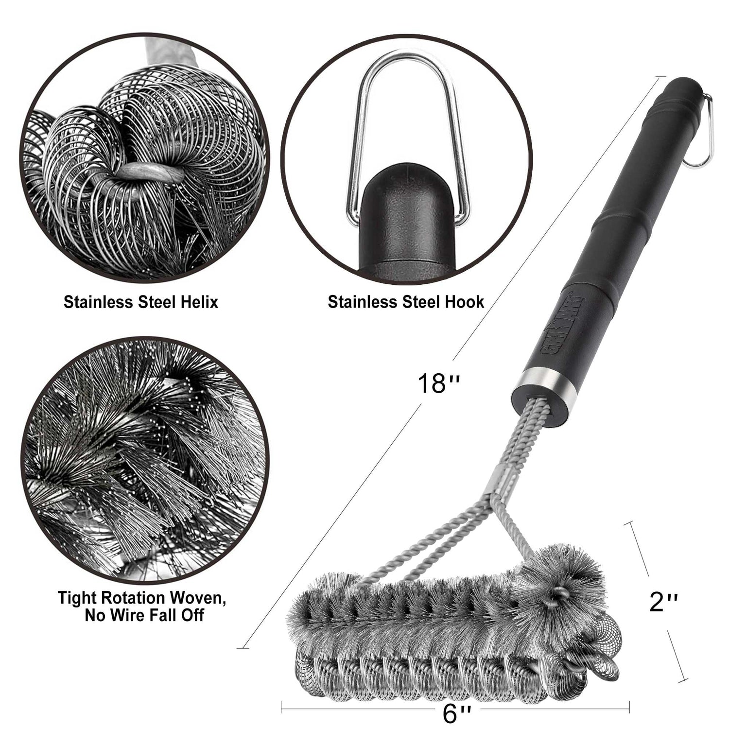 - 【18-INCH ideal handle - portable & easy to use】18” handle not only keeps your hands away from heat but provides you a very comfortable grip. Made of high-quality anti-skid material, neither slip nor snap under great pressure, feel free to use as much elbow grease as you want. Also, it’s light weight but long lasting & not bulky, so it can easily travel with you for tailgates, trips to the beach or lake and camping. Anyone can full control this safe grill brush with ease & love its cleaning performance