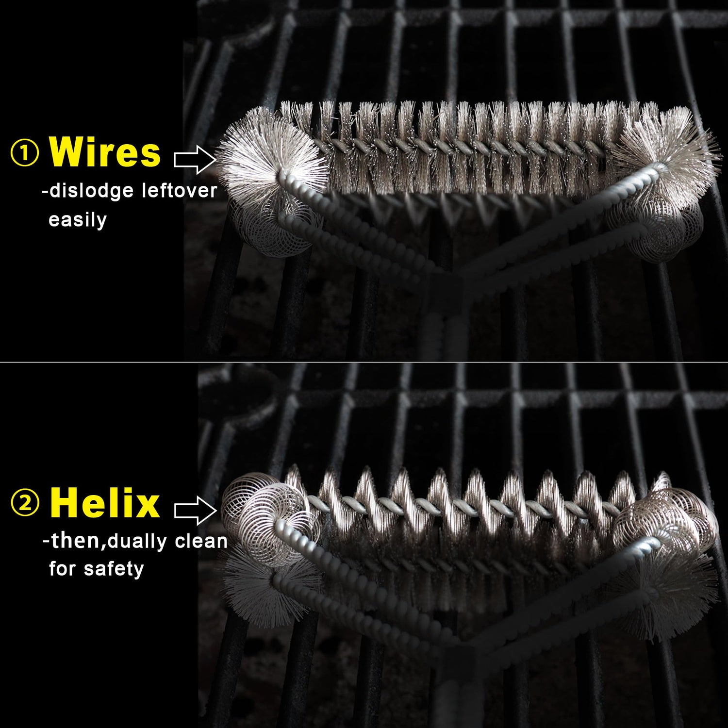 - 【Safe & efficient 2in1 - 【Helix + WIRE】 combo brush】A Wire & Helix integrated brush -Wire brush side can efficiently clean stubborn stains left on grill, then helix side can dually clean it to ensure no possible stray wire can possibly stay on your grill. With this bbq grill brush, you can have the fast-cleaning efficiency of wire brush &stay away from wire ingesting case at the same time. Ever wanna keep your food stay 100% safe, but hate to give up faster cleaning?You'll love it