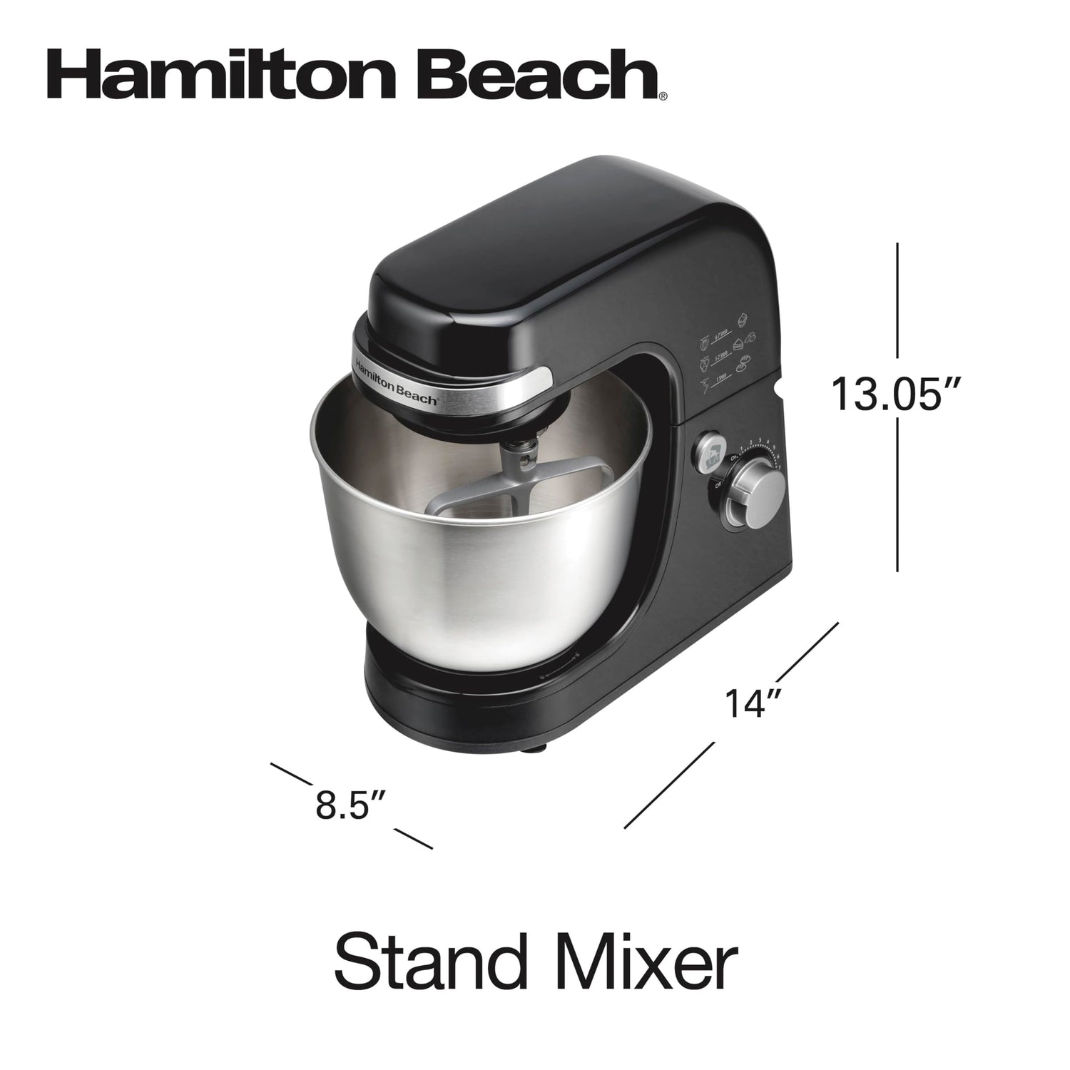 Details: The Hamilton Beach® Stand Mixer easily handles every mixing task with 7 speeds and has the same mixing action as the higher-priced brands for complete bowl coverage. Includes 4 quart mixing bowl, dough hook, whisk, flat beater and splatter shield.
