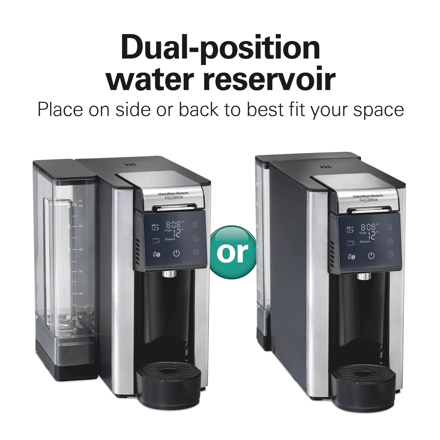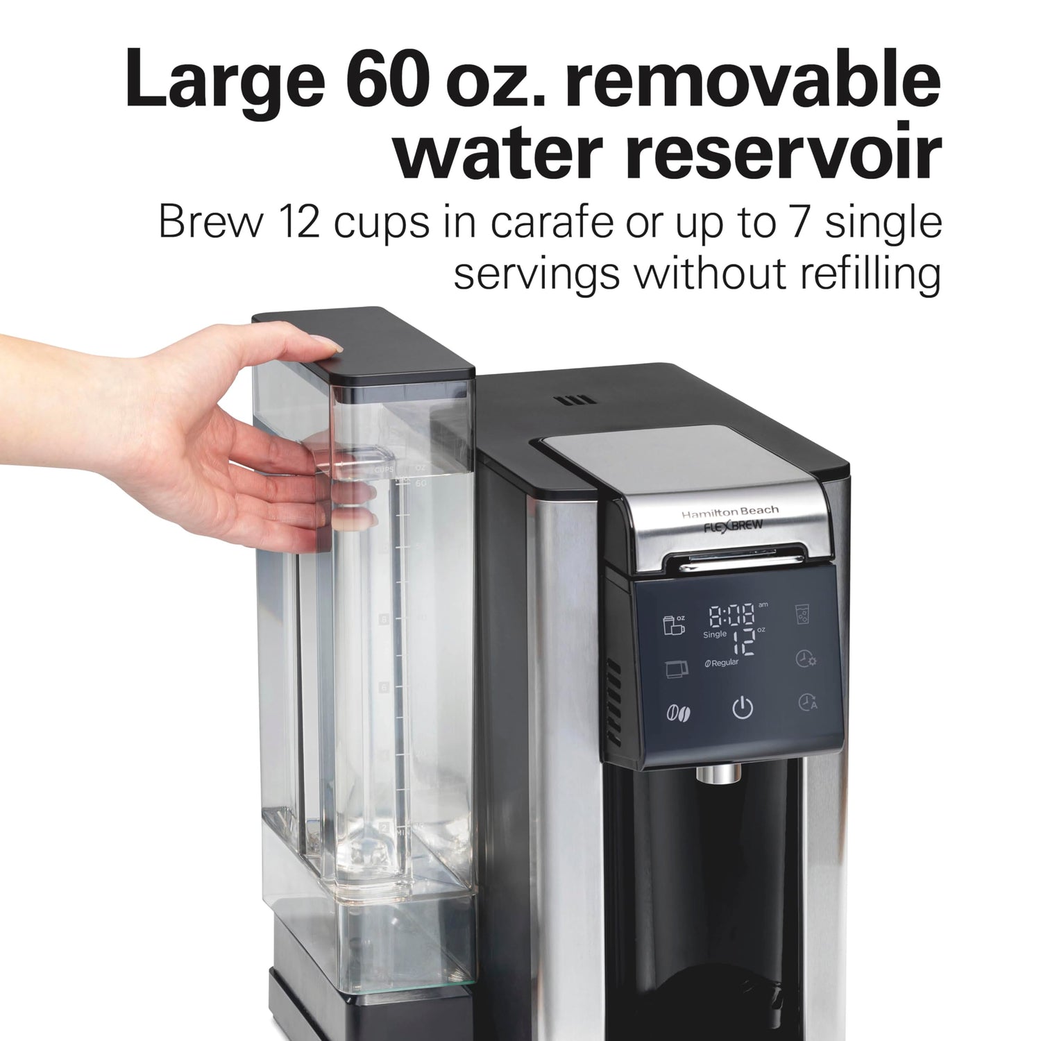 Details: Enjoy 5 ways to brew with the Hamilton Beach® FlexBrew® Advanced 5-in-1 Coffee Maker. Brew a cup of iced or hot coffee with a pod or ground coffee in your choice of sizes or brew a 12 cup carafe with ground coffee. Includes 60 oz. water reservoir.