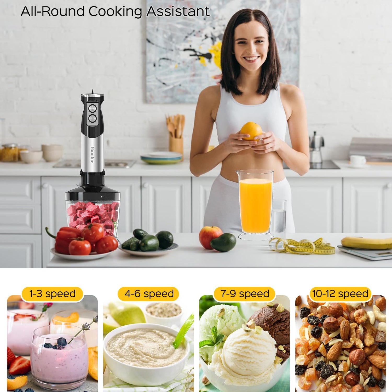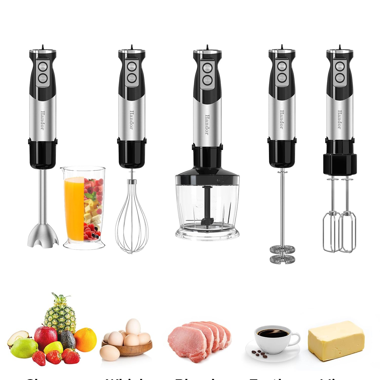 Handor 6-in-1 Hand Immersion Blender, 1000W 12 Speed Handheld Blender with 600ml Beaker, 500ml Chopper, Egg Whisk, Milk Frother, Stainless Steel Blades for Soup, Smoothie, Puree