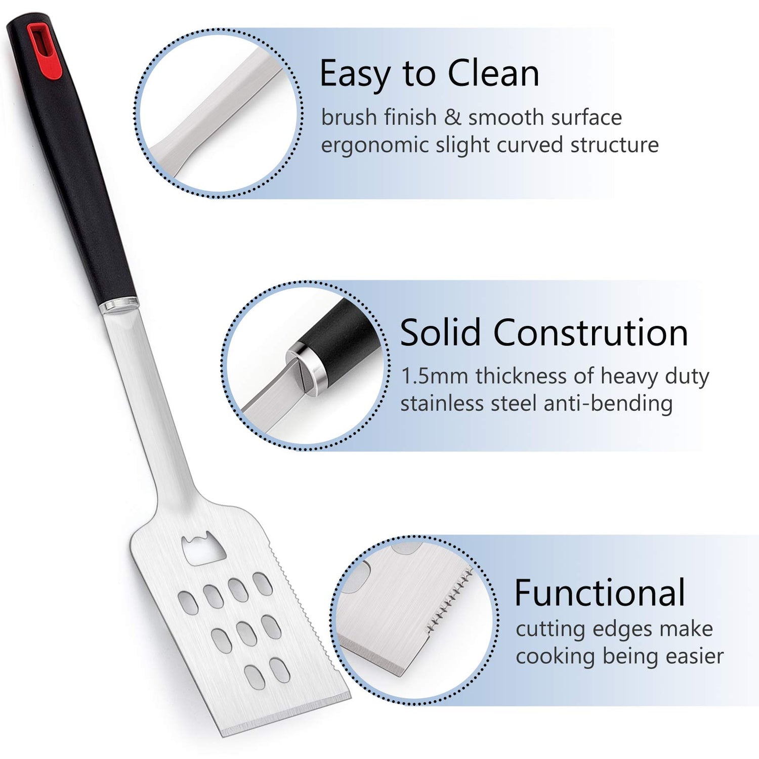 • HELPFUL TOOLS - 4-in-1 grill spatula features bottle opener, perforated, serrated and beveled are functional to make cooking being easier, Fork is sharp enough to pierce through any meat or vegies and tong can pick up large or small pieces, Clean brush is bristle free to ensure safe use